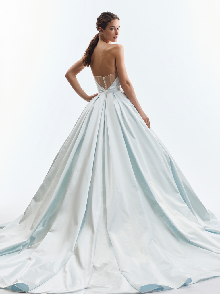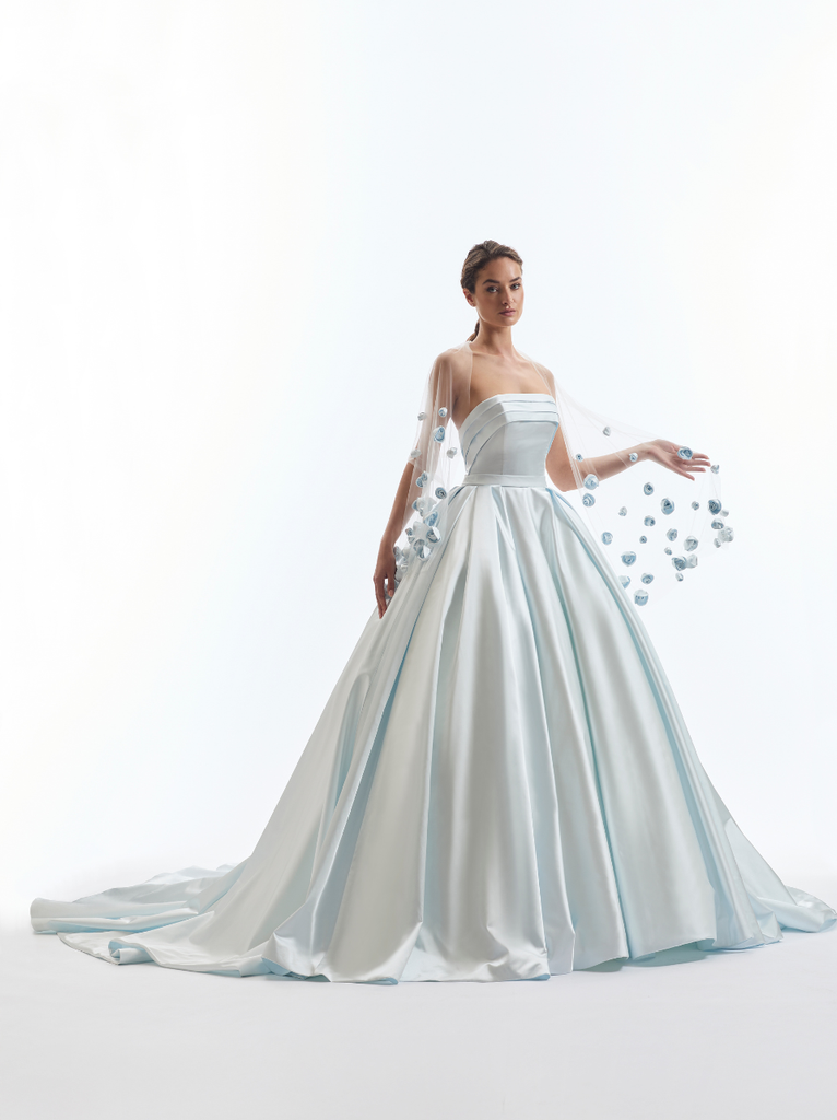 A modern fairytale ball‑gown in lustrous satin, features a structured strapless bodice with architectural horizontal pleating at the neckline and a defined natural waist. Below, deep inverted box‑pleats open into a full, chapel‑length skirt that sweeps the floor with elegant volume. The matching SF4 sheer scarf—lightly scattered with dimensional blooms—drapes softly over the shoulders for a finishing touch of ethereal romance.