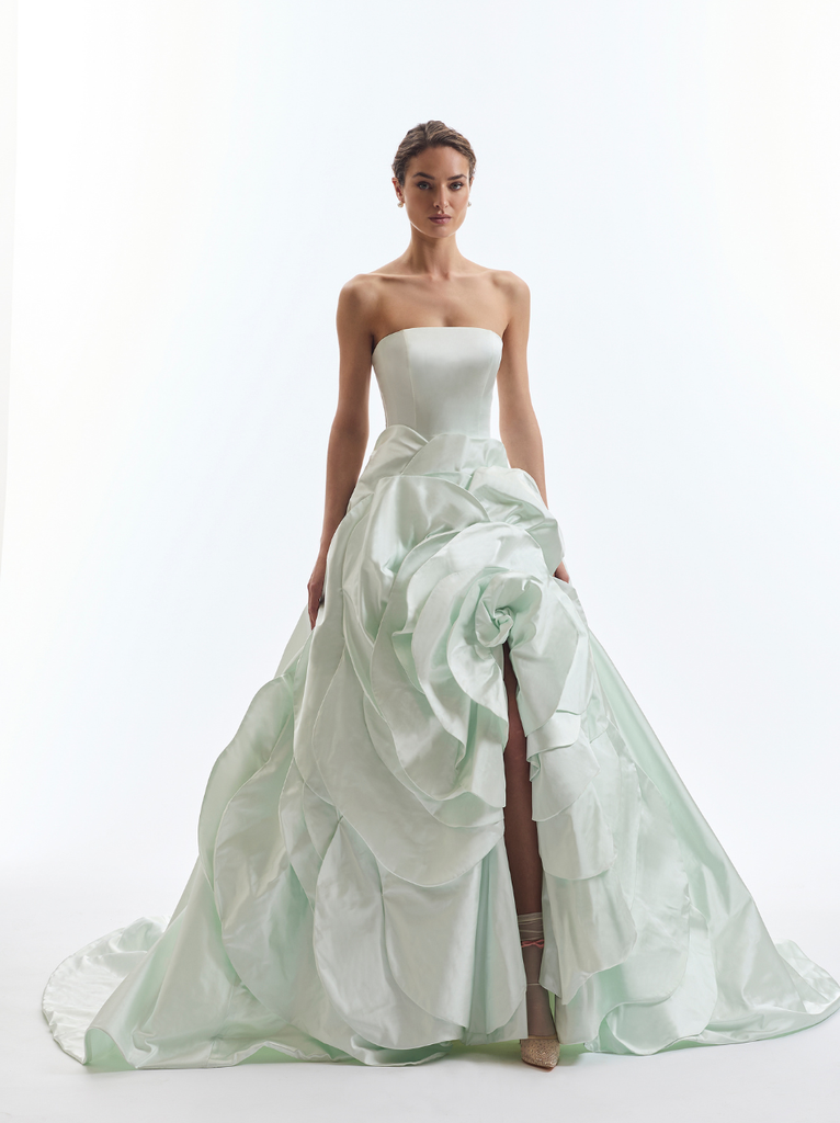 A modern sculptural ball‑gown in sumptuous satin, is defined by its clean, strapless straight‑across bodice that cinches into a smooth, fitted waist before exploding into an artful cascade of oversized, petal‑shaped drapes. The voluminous spiral‑like overskirt reveals a daring thigh‑high slit and flows into a sweeping chapel‑length train, marrying minimalist elegance with dramatic couture flair.