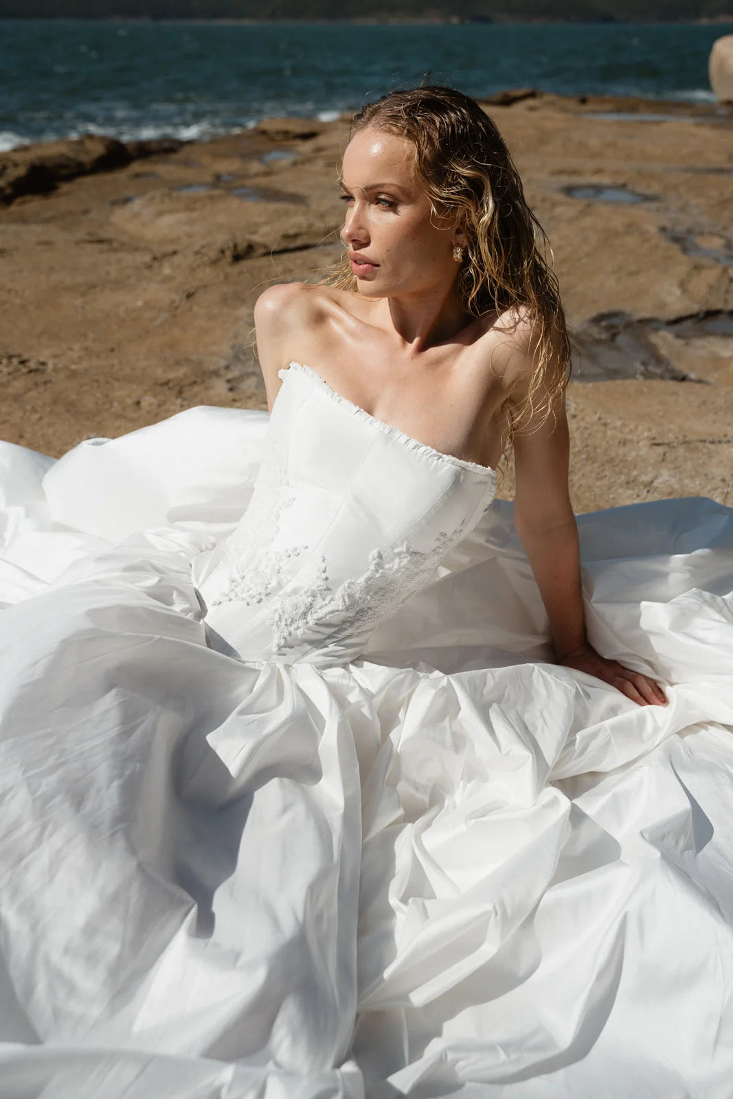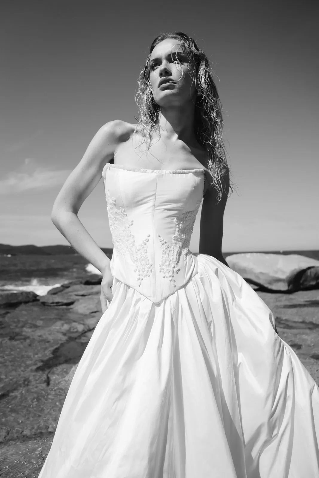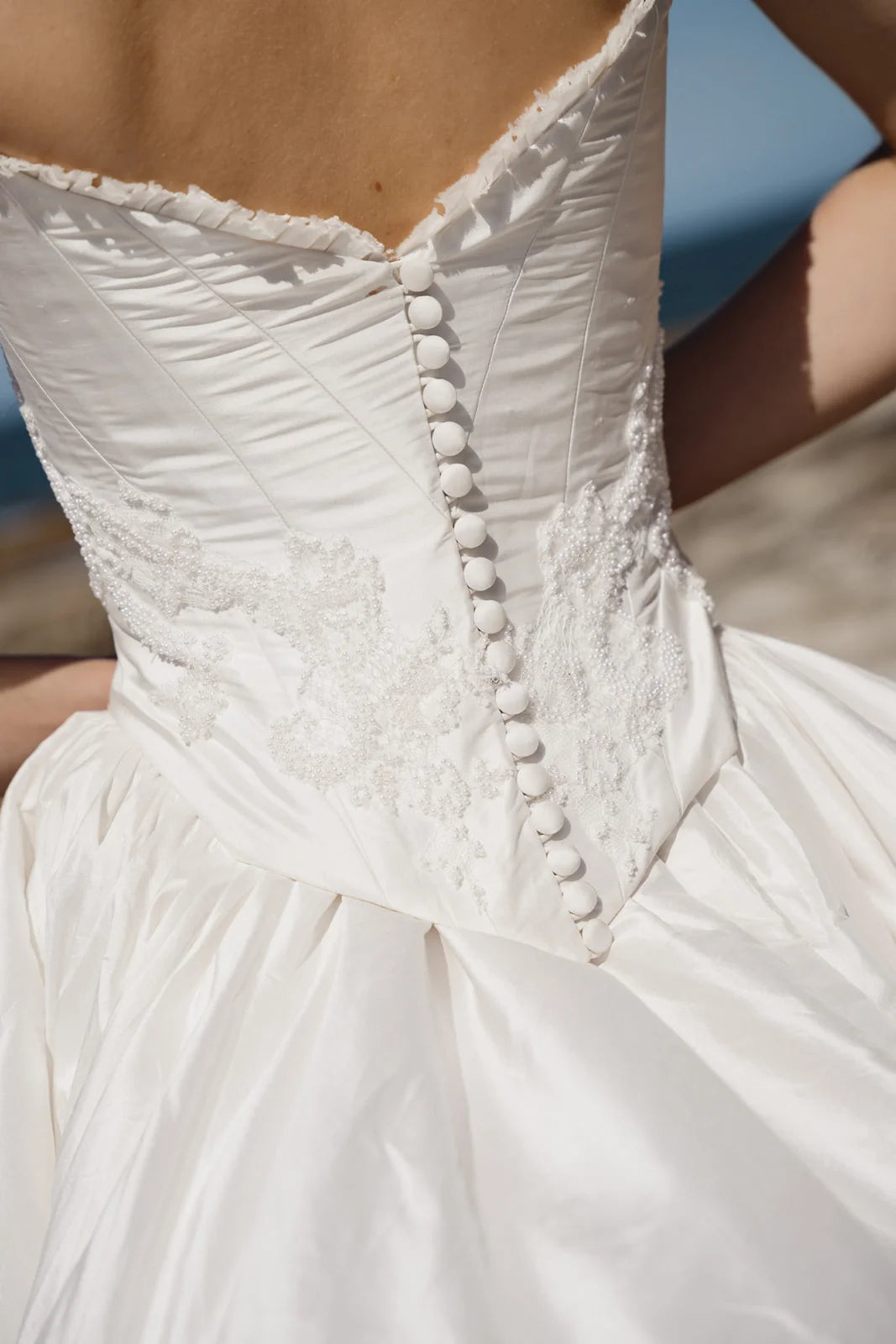 The Tempeste Bodice is the perfect foundation for a modern bridal look. Crafted from luxurious raw silk, this corseted piece cinches beautifully at the waist while hand-beaded lace adorned with pearl details creates an understated luminescence. A delicate hand-ruffle frames the neckline with elegance. As part of the versatile Tempeste separates collection, this bodice pairs seamlessly with the gathered skirt to create your complete gown—or mix and match to express your unique style. Effortlessly striking and designed to make you feel confident on your special day.