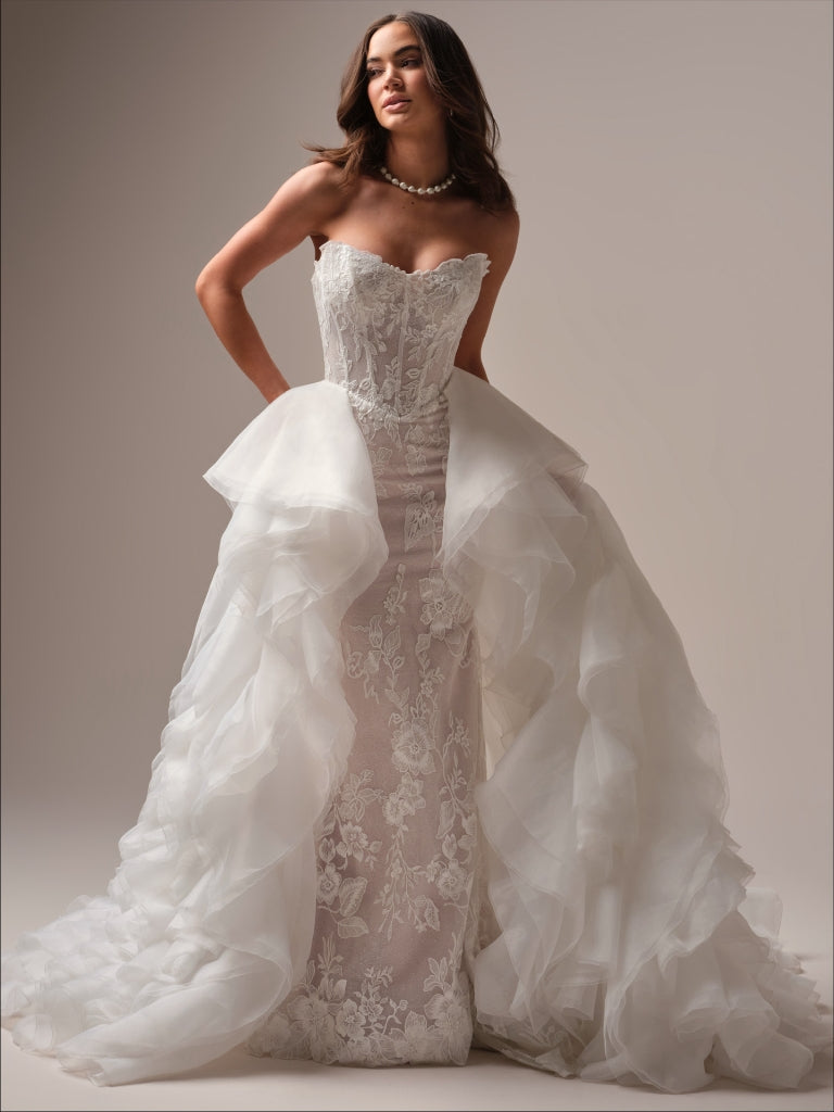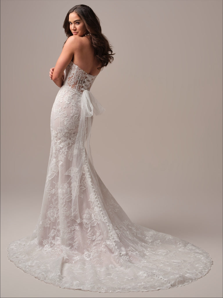 This romantic mermaid wedding dress features sultry sequined lace motifs layered over glitter tulle, creating a dramatic and eye-catching look. The illusion bodice and cat eye neckline add a touch of allure, while the basque waist and exposed boning detail provide a flattering silhouette. Lined with luxurious Rosario crepe back satin for a comfortable and elegant fit.