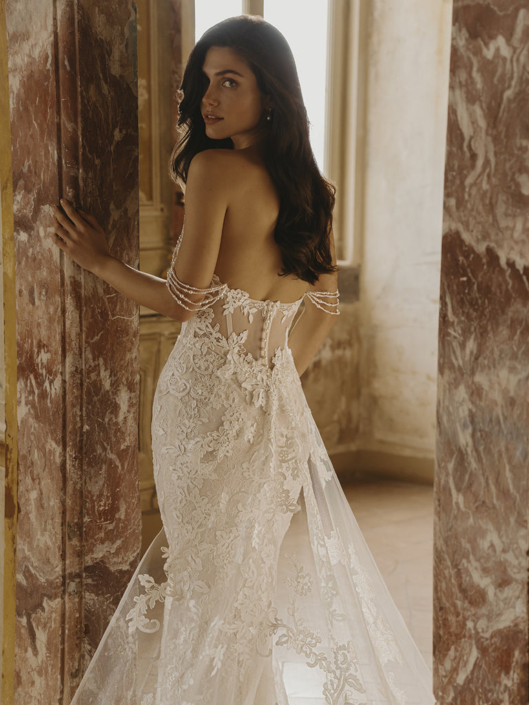 The Davina Dress Unlined from the Pen·Liv collection is a stunning choice for your wedding day. Crafted with floral embroidered and delicate chantilly lace, its fit and flare silhouette beautifully enhances your figure. The scoop neckline adds a romantic touch, while the optional dramatic cape( purchased seperately) and beaded pearl strings create a unique, elegant statement. This gown is designed to make you feel confident and radiant as you celebrate your special moment.