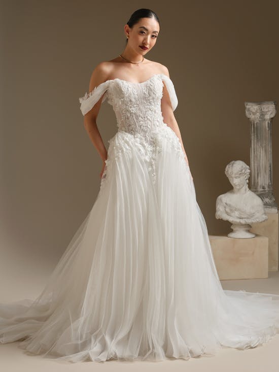Jayna is a stunning bridal gown that combines intricate craftsmanship with timeless elegance. The bodice features an illusion neckline adorned with beaded and sequin lace motifs, while delicate 3-D flowers embellish pleated organza layered over luxurious Chantilly lace and glitter tulle. A defined basque waist flatters your silhouette, and the gown is lined in sumptuous Rosario crepe back satin for comfort throughout your special day. Secured with covered buttons over a discreet zipper, every detail has been thoughtfully designed to make you feel confident and radiant as a bride.