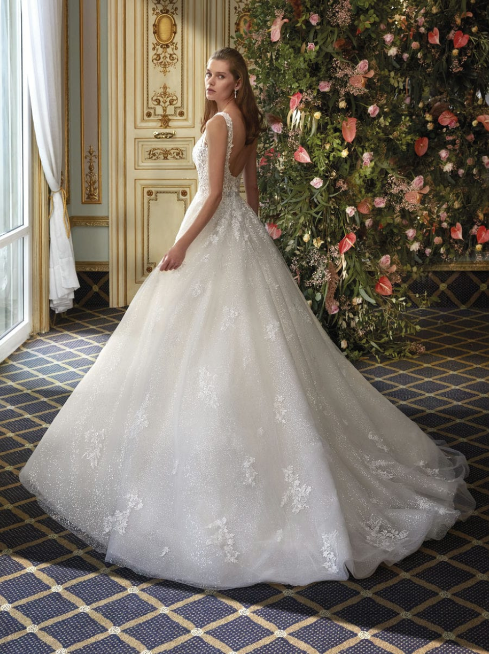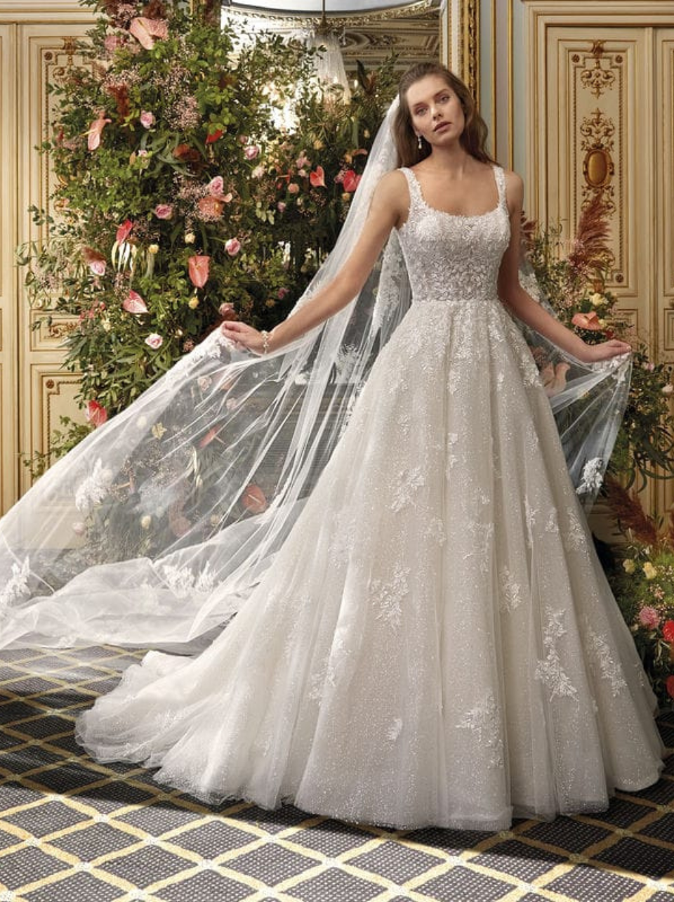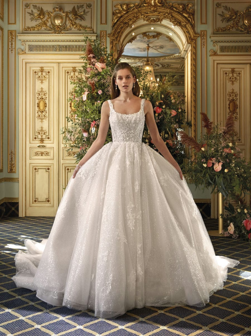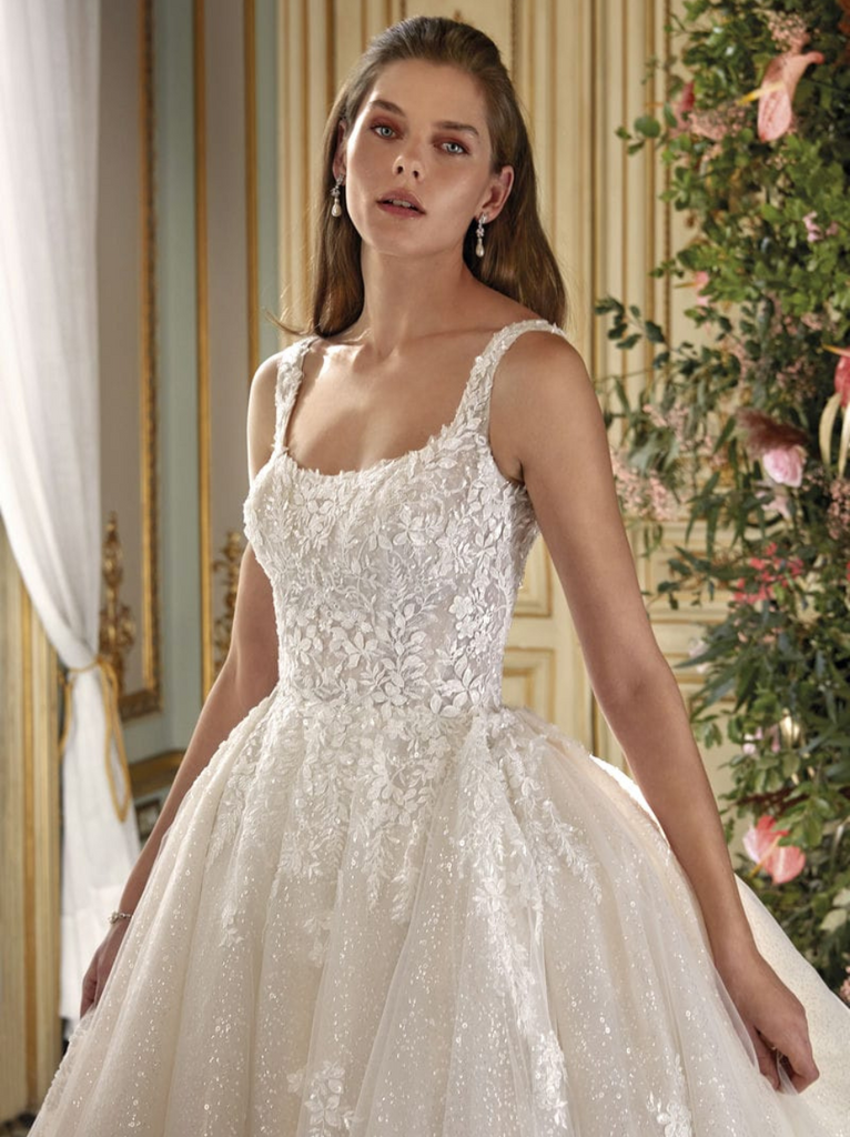 Mesmerize in the iridescent Lucca design with lavish lace and sparkling tulle. The scoop neckline is framed perfectly by the ball gown silhouette. Another amazing element of this style is the detachable cathedral train that tranforms into a floor length gown. An ideal choice for the bride searching for a 2 in 1 look. Gown additions include matching train.