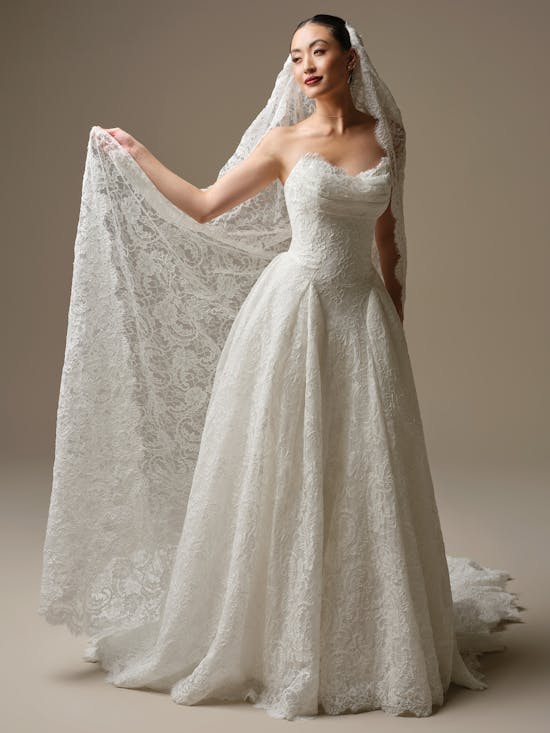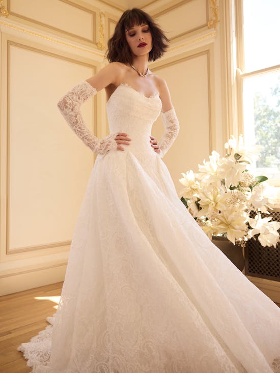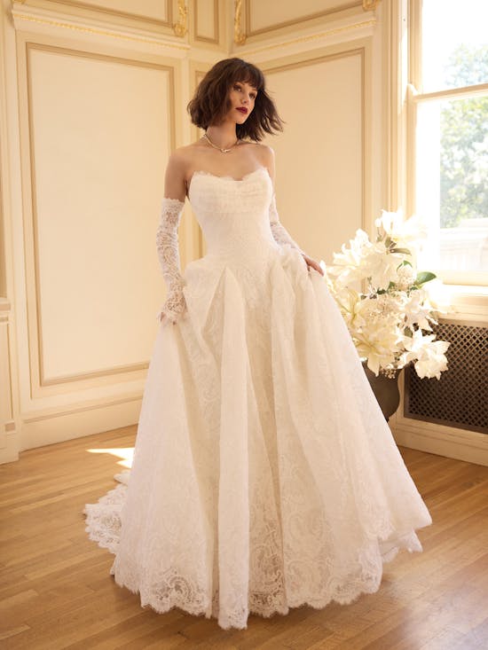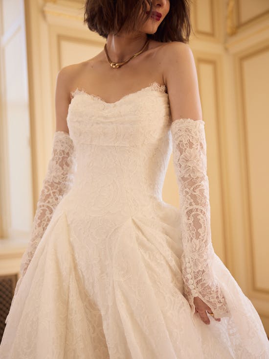 Tamar is an elegant bridal gown that celebrates understated sophistication. Crafted from unembellished allover lace, this strapless sweetheart neckline design features an asymmetrically draped front bodice that creates graceful movement and visual interest. The gown is lined with luxurious Rosario crepe back satin, with an inner layer of Kahili recycled content lining made from 100% recycled polyester—a thoughtful choice for the conscious bride. A discreet zipper with inner corset closure and covered buttons trailing to the hem ensures a secure, flattering fit, while practical pockets add everyday wearability to this timeless piece.