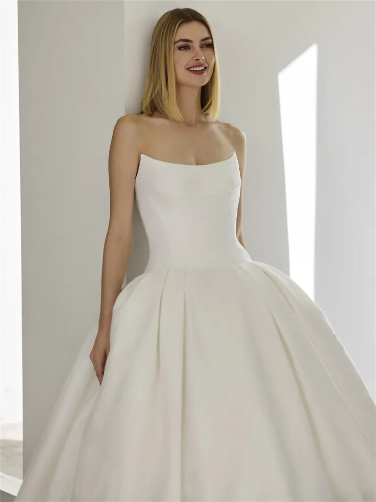 This elegant Valley Soft Mikado dress features a princess silhouette with a strapless neckline, creating a timeless and flattering shape. Crafted from luxurious Mikado fabric, it offers a smooth, structured finish. The dress is sleeveless with a low waist design, enhancing the natural figure. A train adds a dramatic and graceful touch, while the unique back detail provides subtle sophistication. Perfect for brides seeking classic elegance with modern refinement.