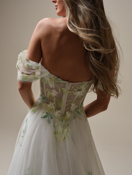 The Vineyard Unlined Bodice combines timeless elegance with thoughtful design details. Crafted from luxurious Cartago satin with a sheer organza-lined bodice adorned with delicate beaded lace motifs, this strapless gown features a soft sweetheart neckline that flatters beautifully. Detachable beaded spaghetti straps offer styling flexibility, while illusion lace tiered peplums gracefully accent the hips. The gown includes a detachable full bodice lining and is lined with eco-conscious Kahili recycled content fabric. A secure zipper closure with covered buttons extends to the hem, and practical pockets complete this stunning bridal piece.