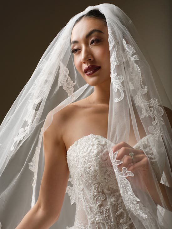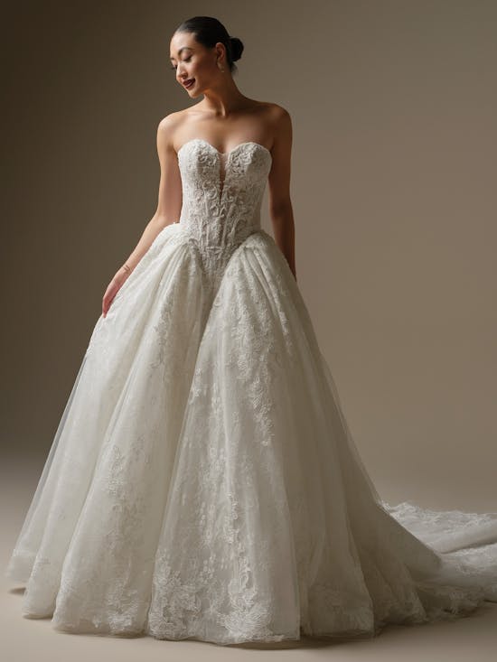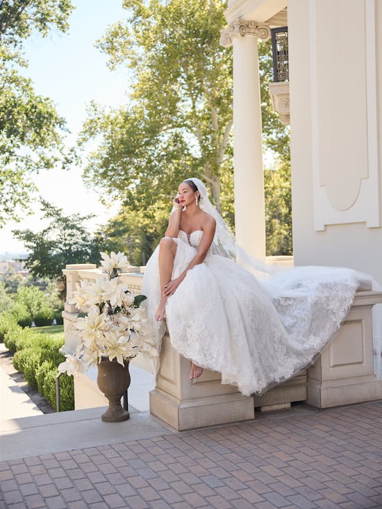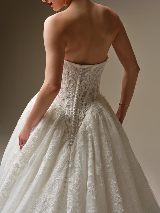 Formal, regal, and unspeakably glamorous, this strapless ballgown wedding dress with beaded lace, corset bodice, and extended sheer lace train sets a new standard for your black-tie celebration. Designed by Sottero and Midgley, Zulani combines timeless elegance with modern sophistication, creating a show-stopping silhouette that captures every eye as you walk down the aisle. The intricate beadwork and structured corset provide both support and stunning visual impact, while the flowing train adds drama and romance to your special day.