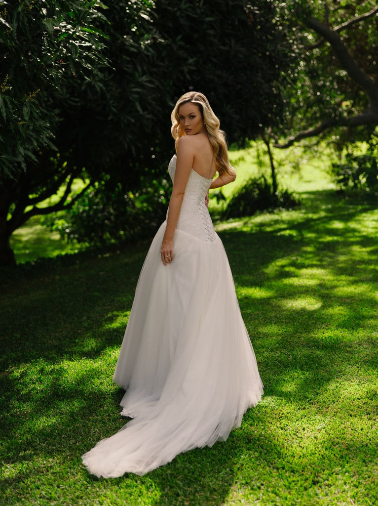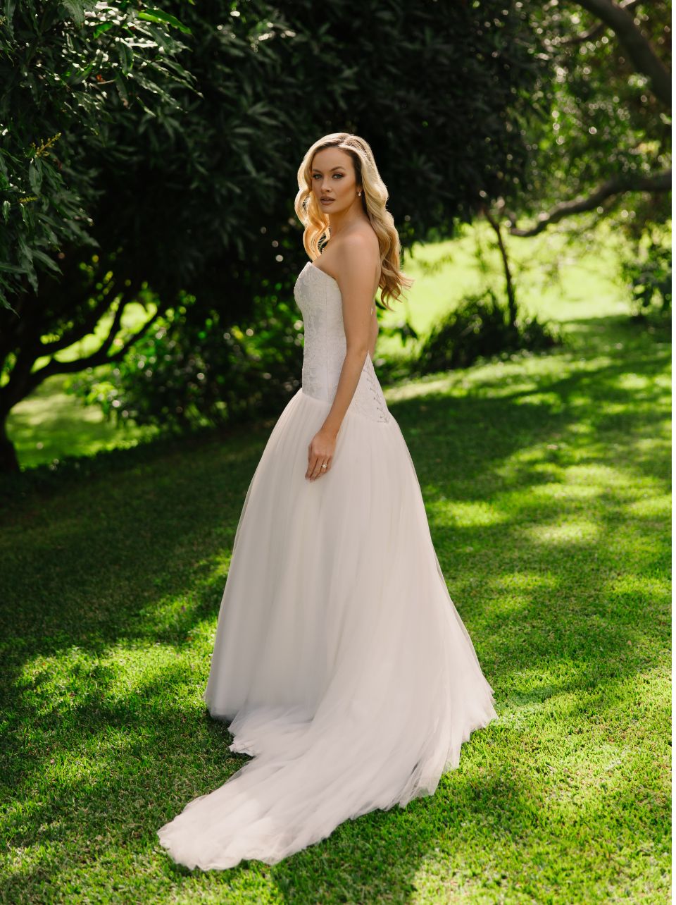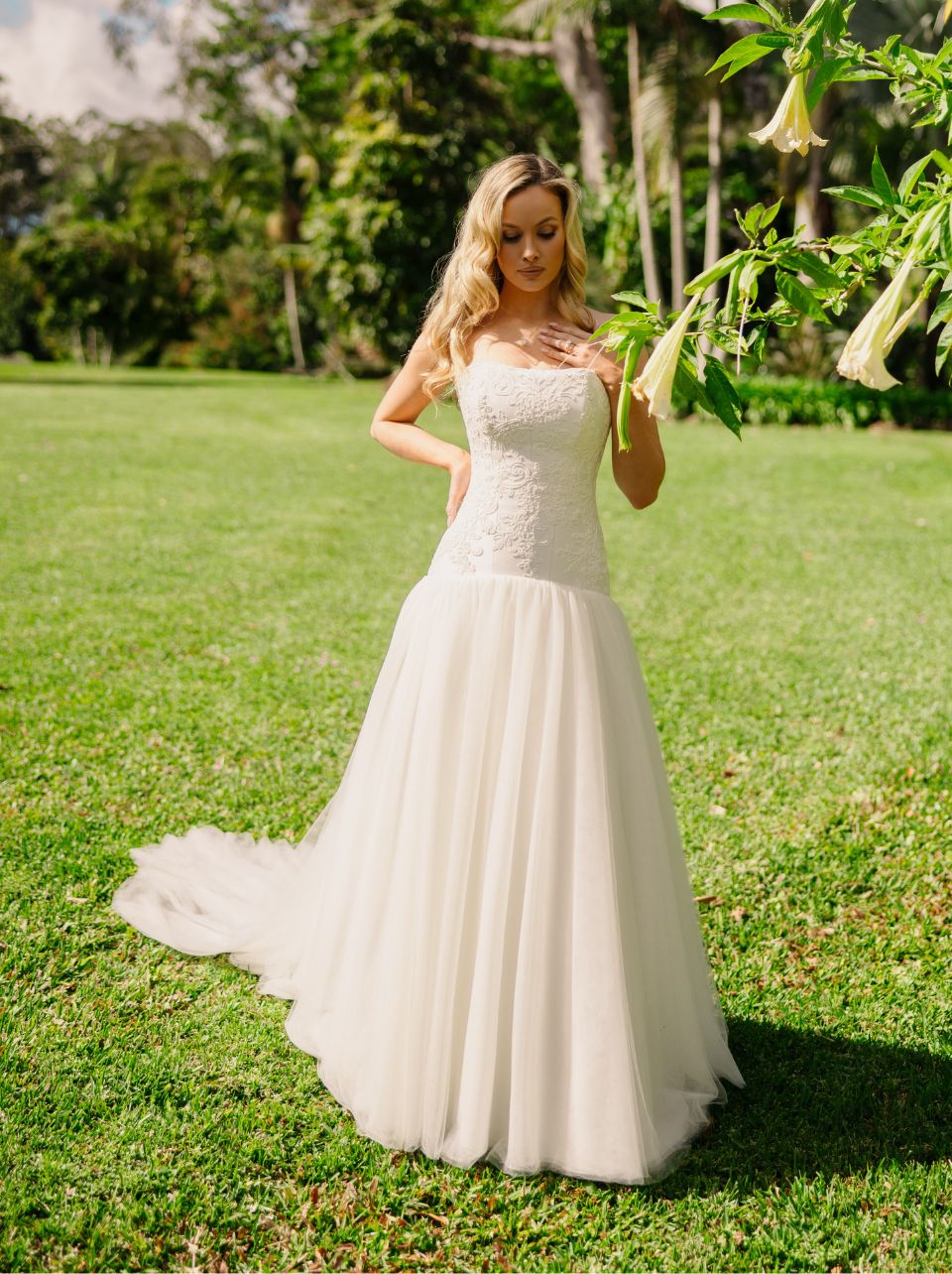 hinking of a romantic wedding dress that’s strapless and has French lace? Our latest drop waist wedding dress Cameron speaks for herself!