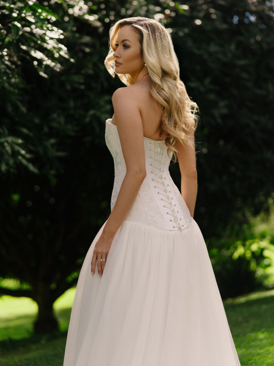 The Cameron gown’s highly structured bodice sculpts the figure, sinching in your waist. Not to mention, creating a swoon worthy silhouette with maximum impact. She is minimalistic but maximalist. This romantic wedding dress features a stunning long lined corset that travels all the way to the low hip. Using our latest state-of-the-art double boning to create an ultra sinched silhouette, Cameron is our most recent regal and quintessential wedding dress for the true romantic bride.