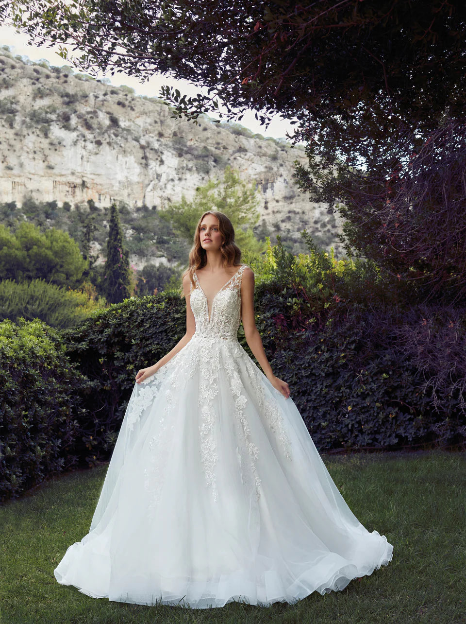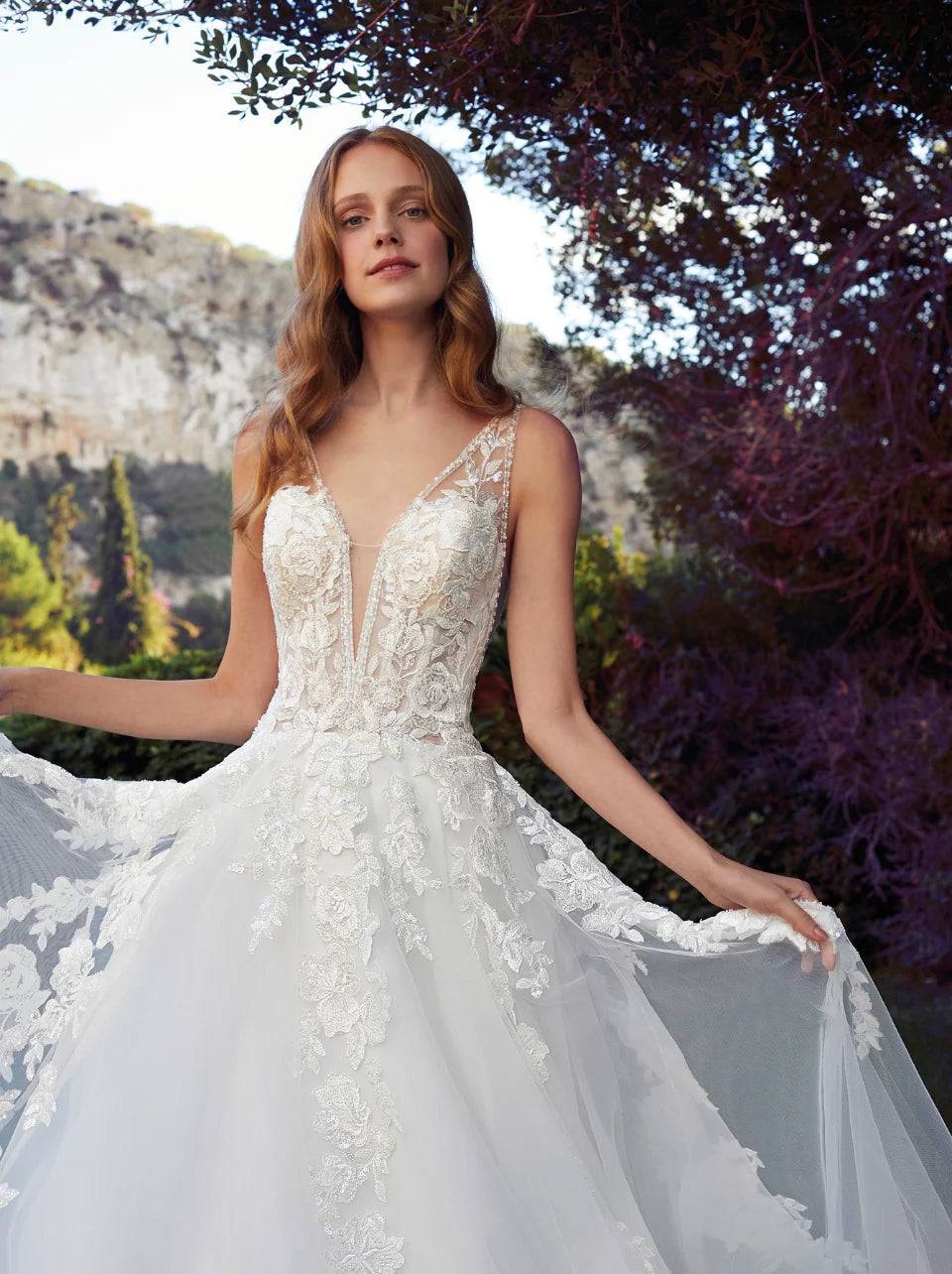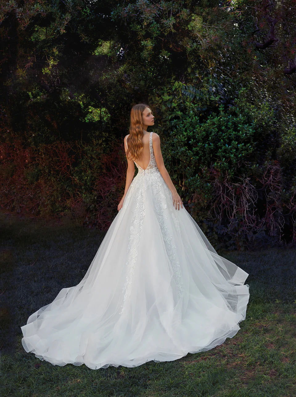A lush Tulle skirt and exquisite beaded lace appliques create this enchanting gown featuring a plunging Sweetheart neckline, sexy low back and Chapel train.