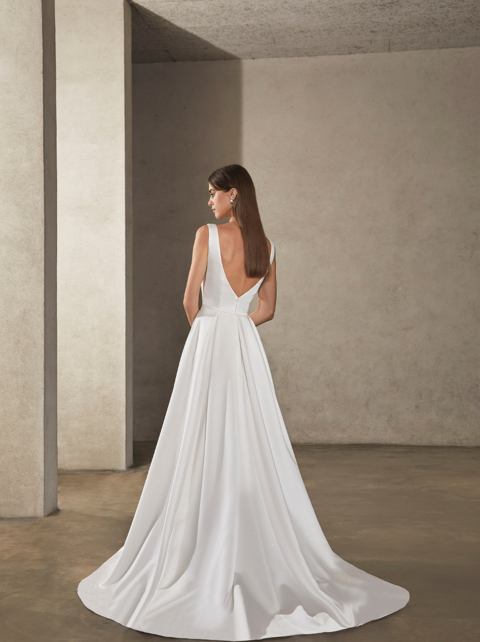 This satin bridal gown radiates chic and modern vibes, featuring a square neckline, thick straps, and a sleek a-line skirt with a subtle hint of leg peeking through.