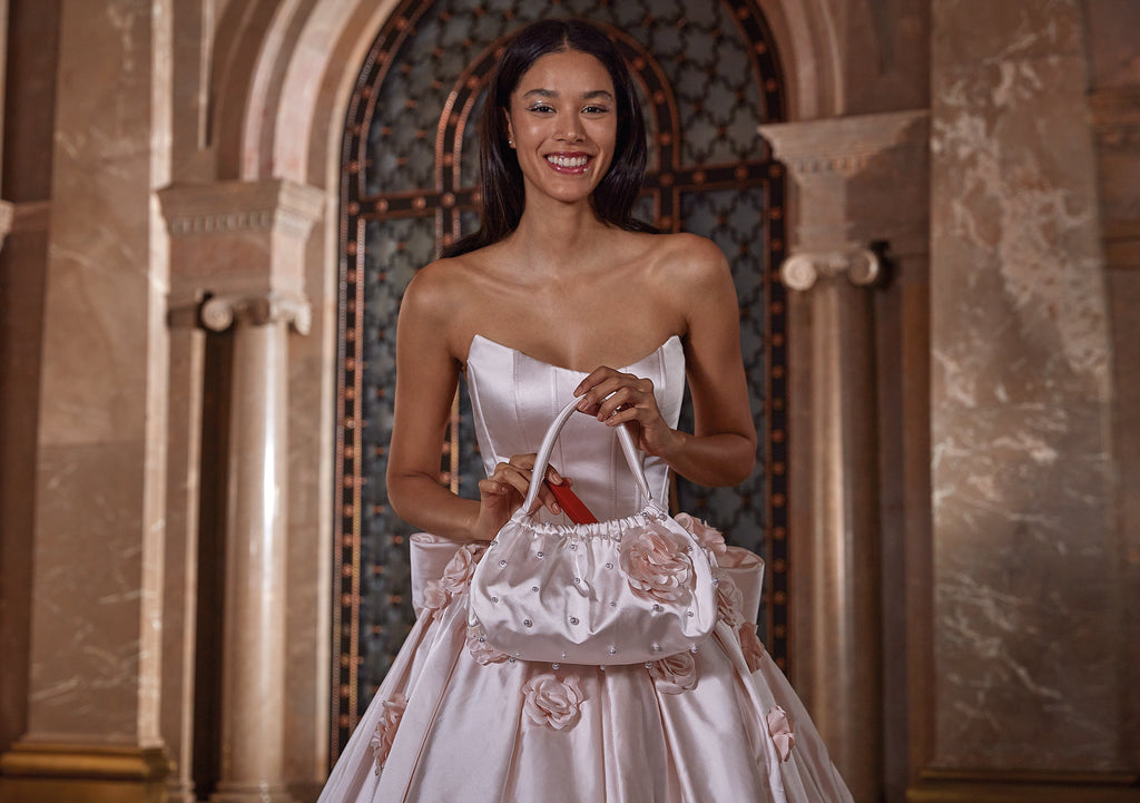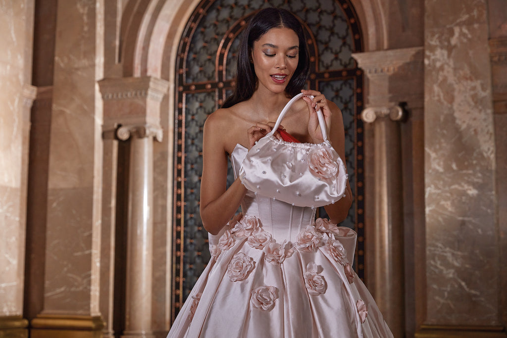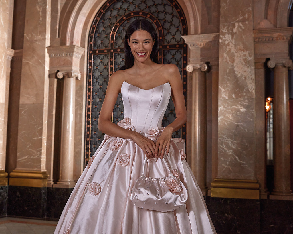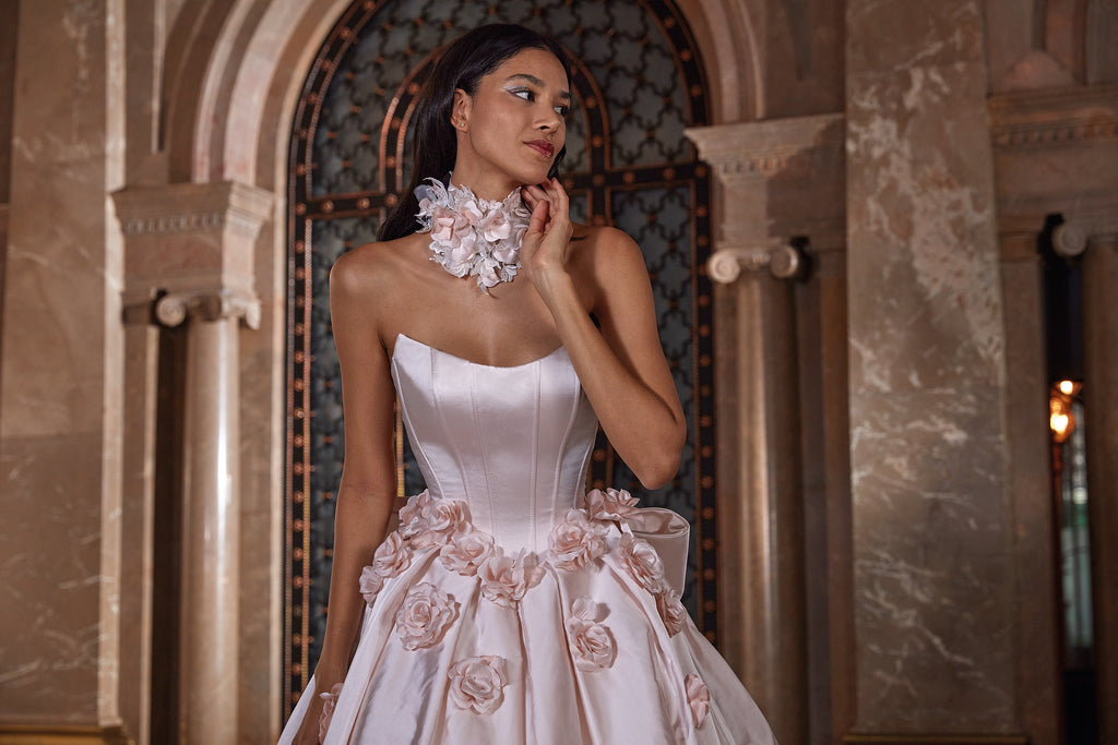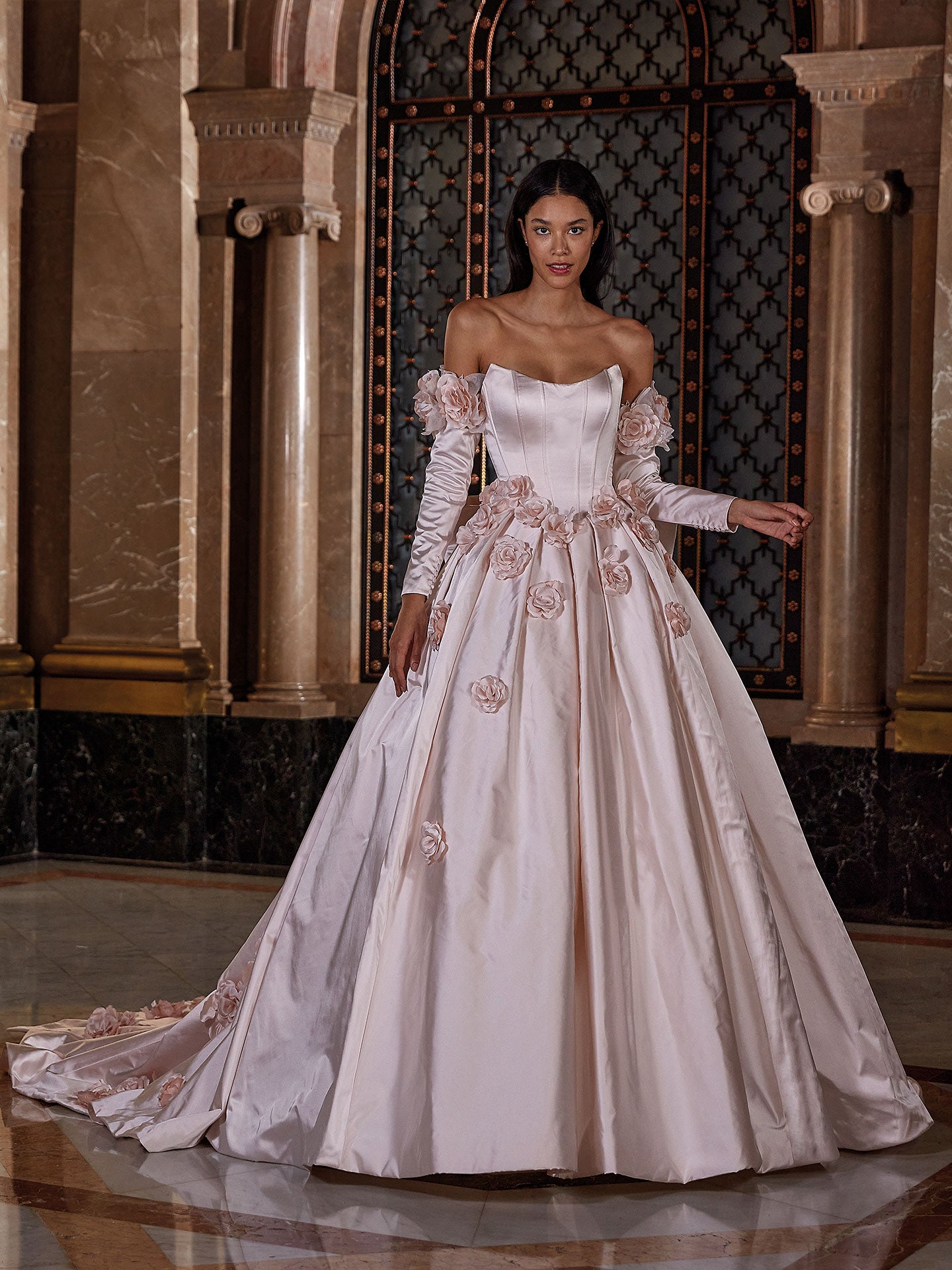 Rosabelle DP552 is a stunning bridal gown that blends vintage elegance with modern sophistication. Made from lustrous blush satin, it features a structured corset bodice and a full pleated skirt adorned with delicate 3D roses, creating a romantic and timeless look. The dramatic satin bow and sweeping train add graceful drama, perfect for a bride seeking classic grandeur. For an even more regal appearance, consider pairing it with the optional matching SL125 sleeves and COL17 floral choker. This gown supports your vision of a memorable and elegant wedding day.