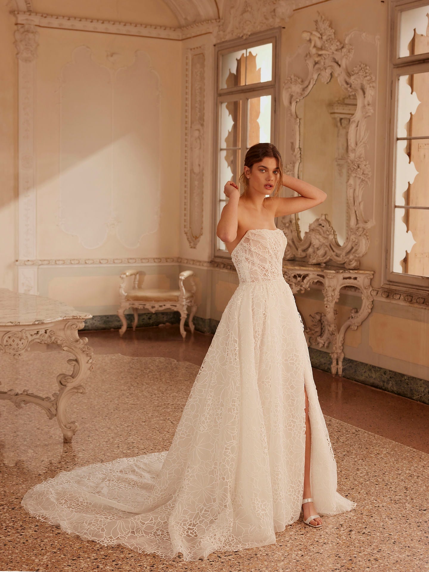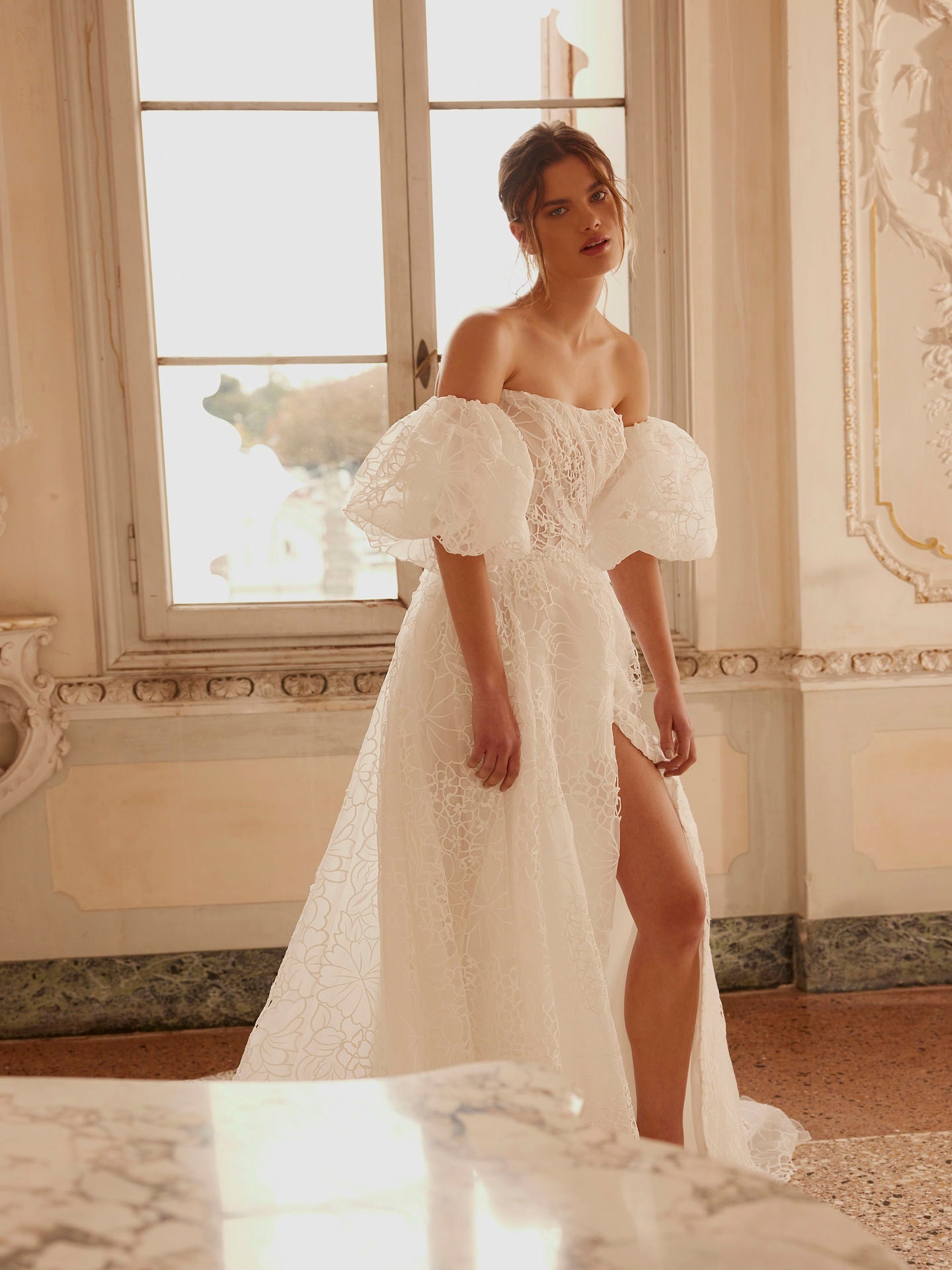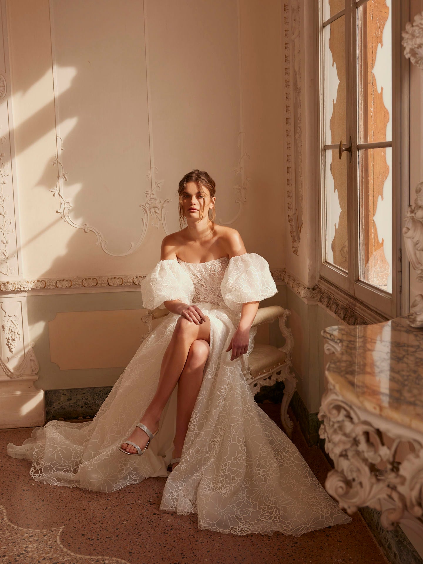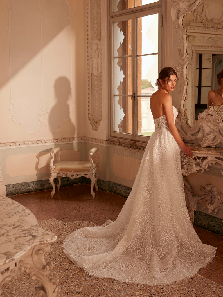 Imagine this: the bridal style 1269 is like a dream come true, blending charm and allure effortlessly. It’s an a-line wonder featuring embroidered organza with a sassy cut-out floral design, a scoop neckline that flows into a delicately ruched bodice, and oh-so-cute matching sleeves for that extra dash of perfection!