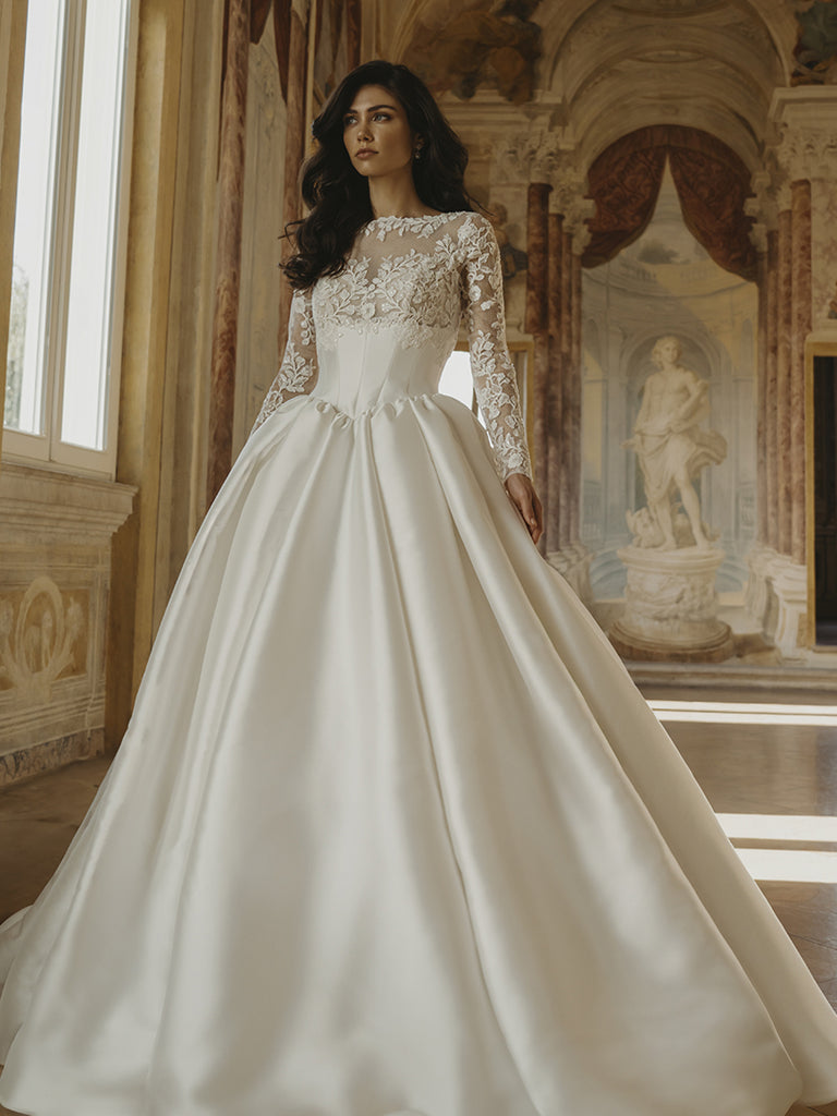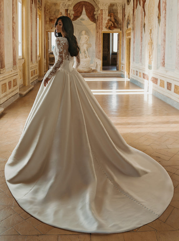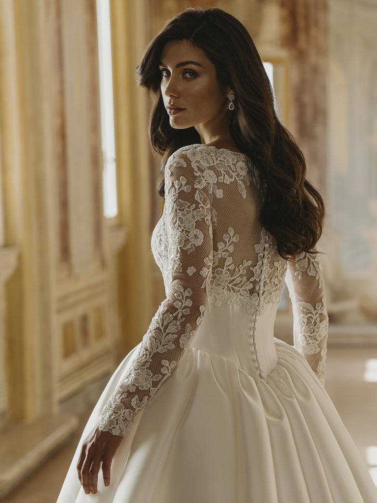 The Dakari bridal gown from the Pen·Liv collection combines luxurious mikado fabric with delicate tulle to create a stunning ballgown silhouette. Its elegant boat neck highlights the collarbones, while the enchanting back detail adds a whimsical touch. Designed to blend timeless elegance with modern sophistication, this gown ensures you feel confident and radiant as you walk down the aisle. Perfect for brides seeking a regal yet playful look on their special day.
