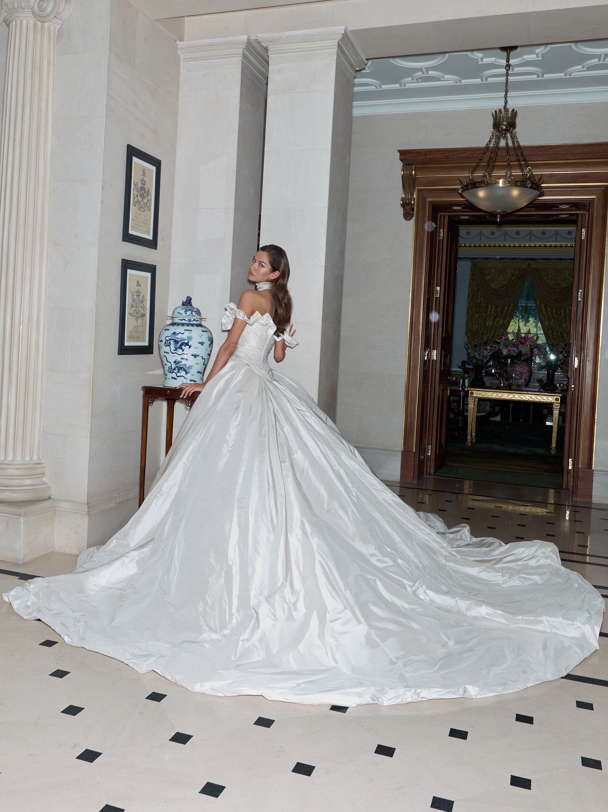An opulent champagne silk taffeta ball gown featuring a masterfully constructed corset and sculpted volume. The straight neckline dips into a soft sweetheart curve framed with antique metallic lace and crystals. Micro-pleats shape the bodice, flowing into a dramatic pleated skirt and sweeping regal train. Empire Choker - Crafted from layers of champagne silk velvet, antique lace, and fine ribbon, the Mercer choker embodies Gilded Age opulence. Its centerpiece-a diamond-set medallion-features a detachable pendant that transforms into a ring or necklace, blending grandeur with timeless versatility.