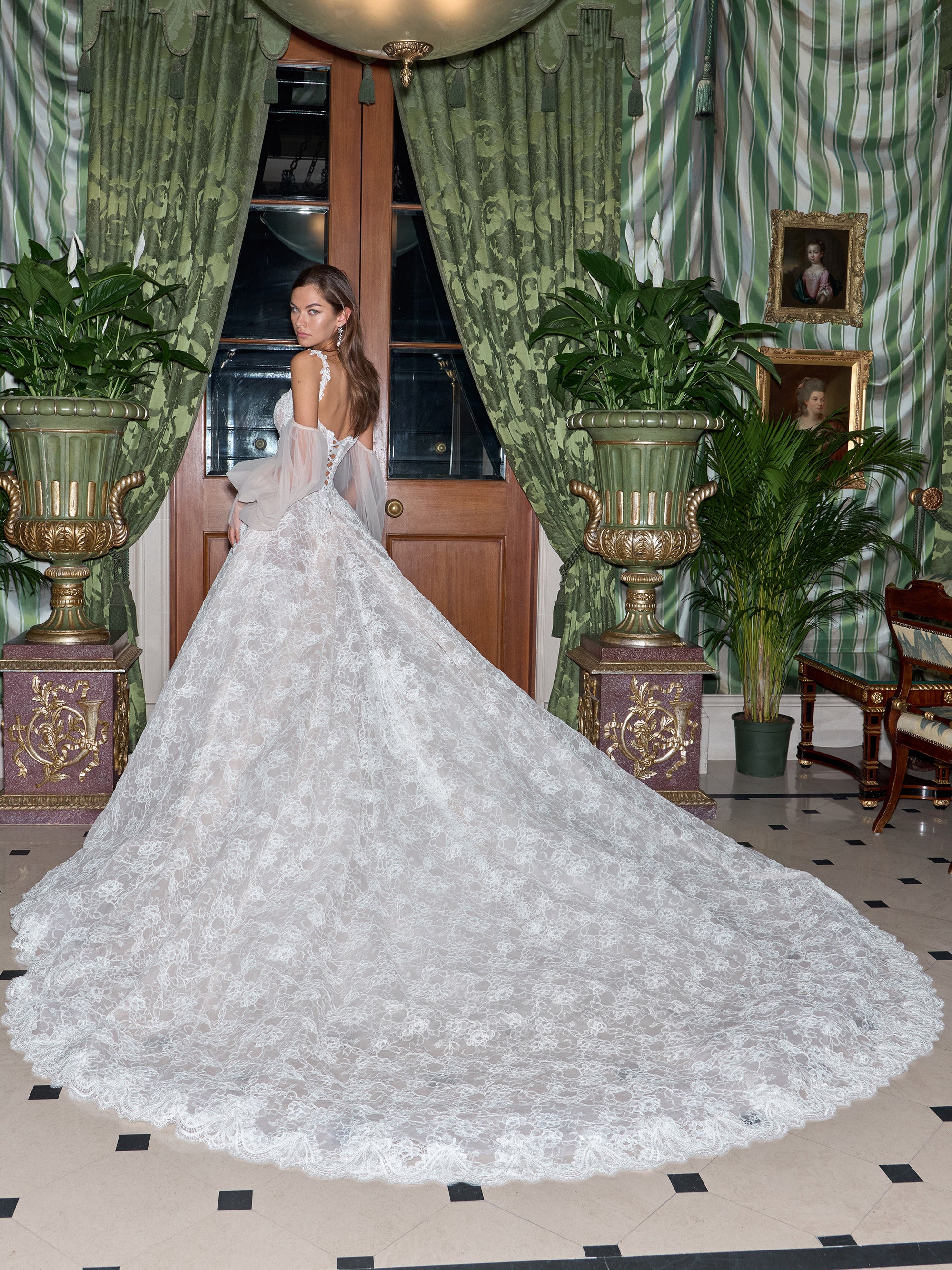 SLEEVES: Dramatic off-the-shoulder tulle bishop sleeves billow with airy grandeur, while elongated lace cuffs trace the wrists in elegant detail. Mirroring the bodice’s intricate lacework, they add a refined, romantic flourish to the gown’s sculptural silhouette.