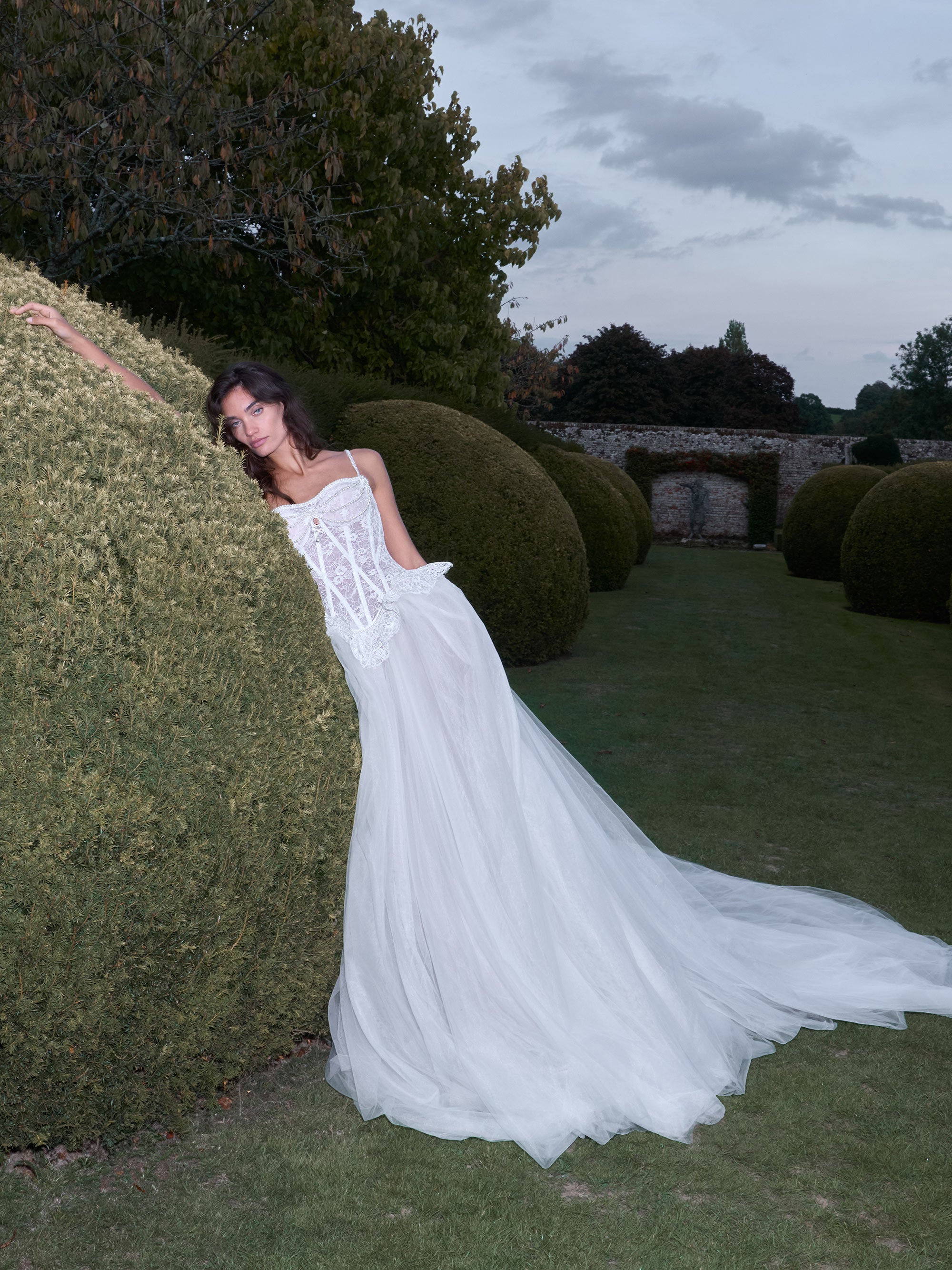 Penny is a show-stopping two-piece mermaid gown that celebrates theatrical romance. The corset features a low oval basque waist and scoop neckline flowing into voluminous tulle balloon sleeves with ruffled lace cuffs. Dramatic pearl strands drape across the bodice, anchored by a vintage cameo brooch, while a lace ruffle peplum adds sculptural volume at the waist. The fitted lace mermaid skirt below creates elegant contrast. Complete the look with the included full tulle overskirt and sleeves, built on a French panier petticoat that flares dramatically from the waist. Doll-like, bold, and unapologetically theatrical—Penny is designed for the bride who embraces personality and presence.