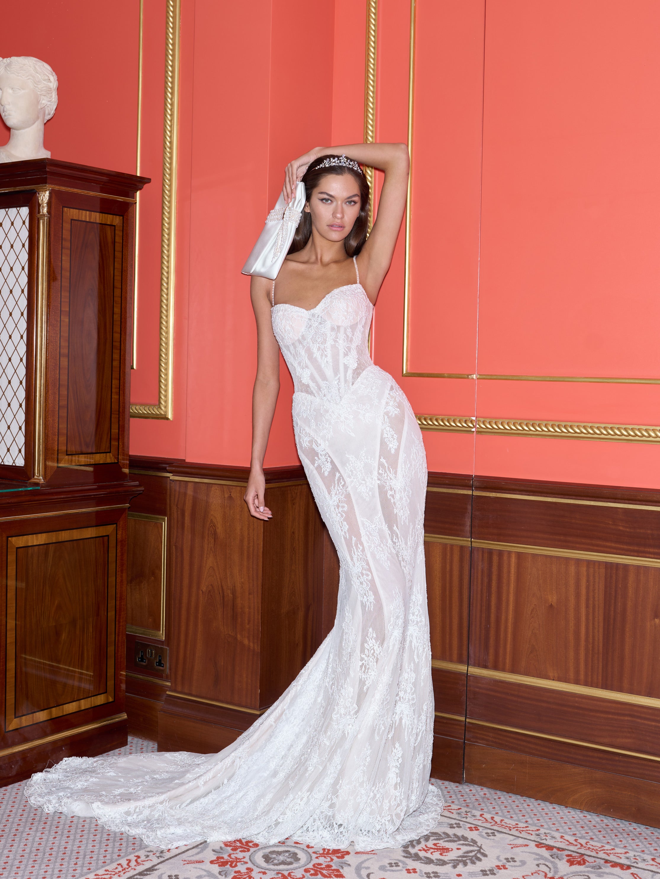 A sculpted masterpiece in hand-beaded French lace, Waldorf features a cateye neckline, sheer side panels, and a sharply defined basque waist flowing into a fitted skirt. Its detachable top transforms the look into an off-the-shoulder silhouette with long sleeves, balancing sensuality, versatility, and modern couture sophistication.