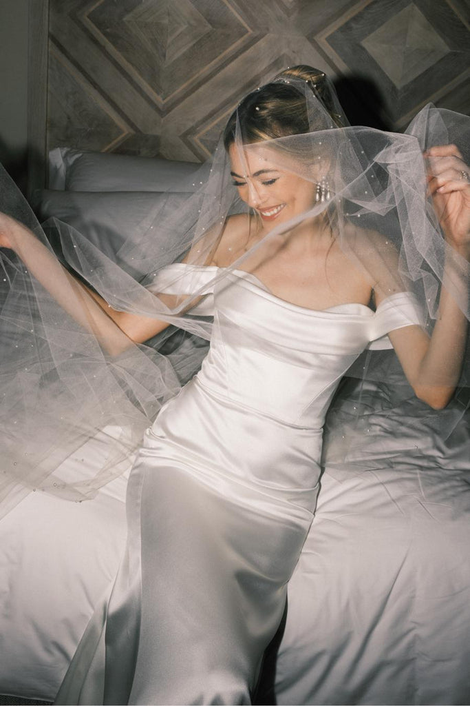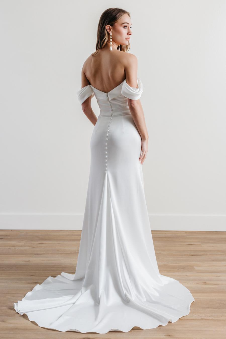 Charming in every sense. With an off-the-shoulder draped bodice and a fit-and-flare skirt, Charm is made for the bride who wants to show off her curves with a dash of drama. This sultry sheath is crafted in fluid charmeuse that moves like a dream, making it perfect for your wedding-day moments, from aisle to reception.