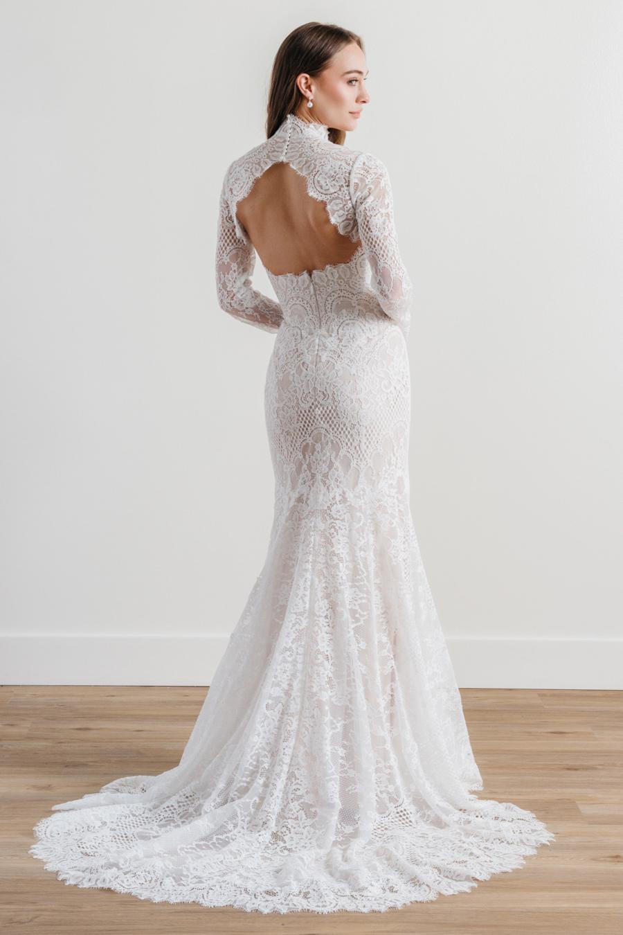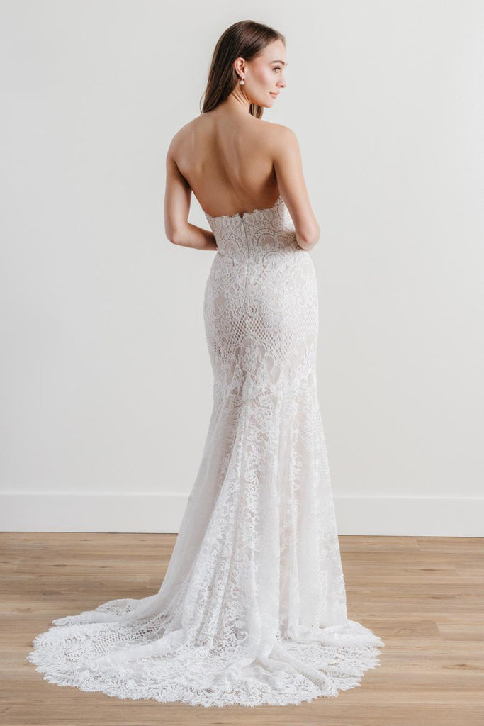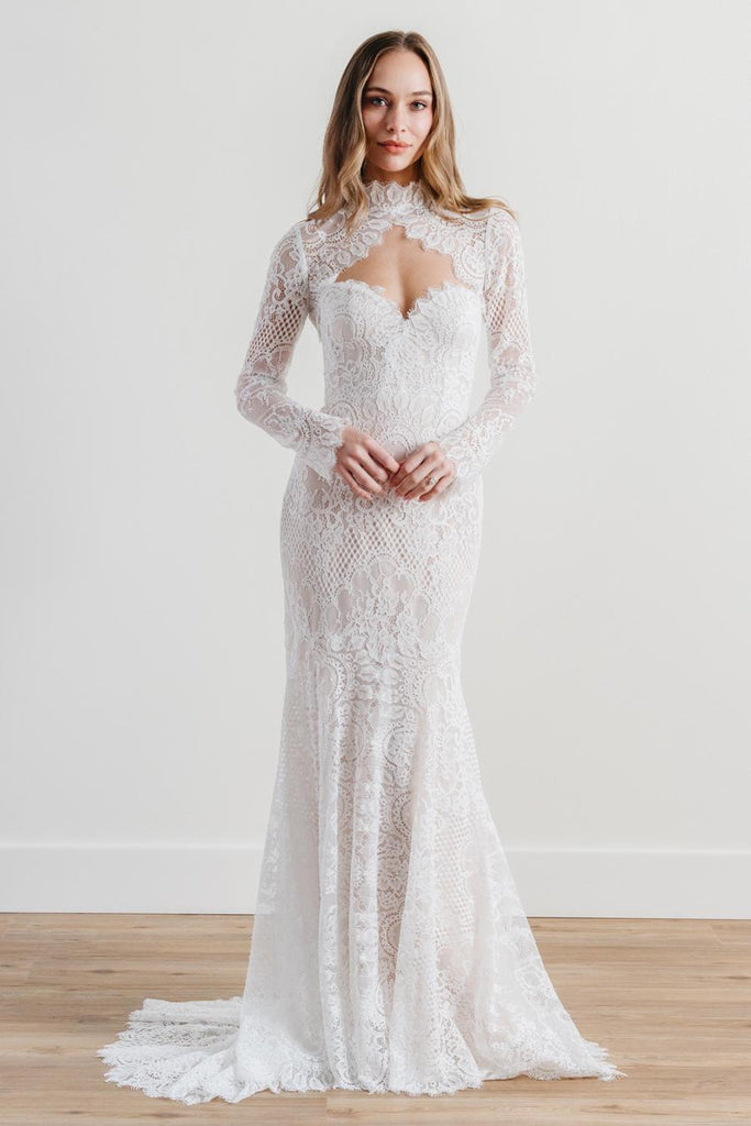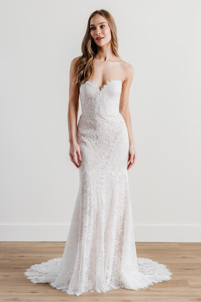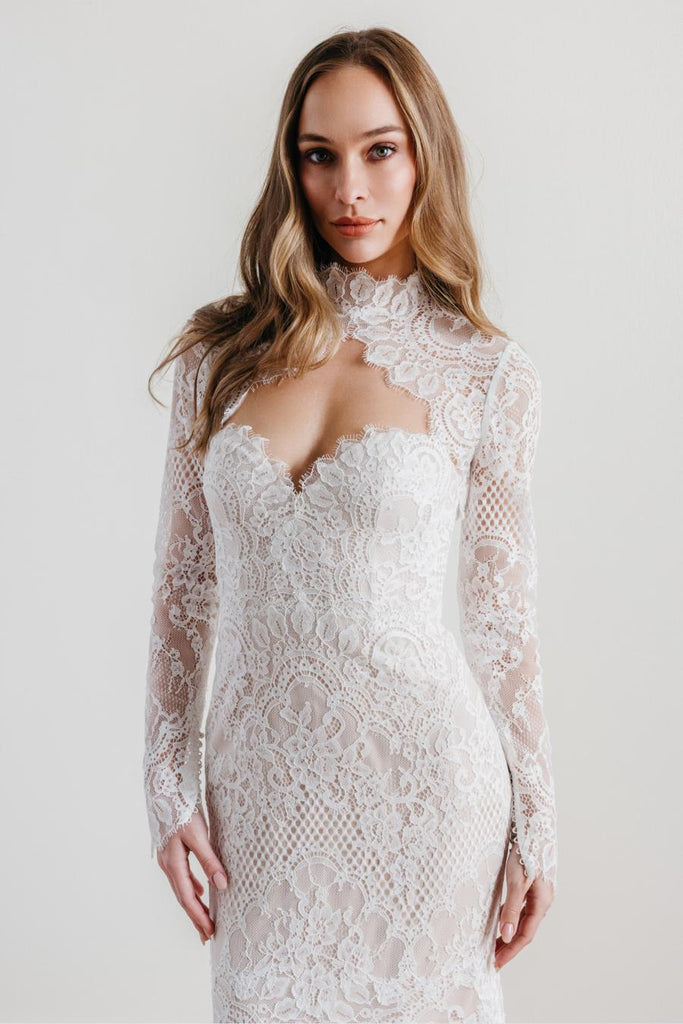 Two looks. One dress. Zero compromises. Fili with Topper is a romantic sheath wrapped in soft stretch lace and dotted netting, designed to hug you in all the right places. The strapless sweetheart base is effortlessly chic, while the removable long sleeve topper adds a touch of vintage charm. Switch up your vibe from ceremony to reception without skipping a beat.