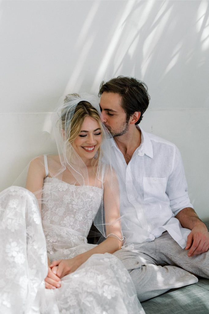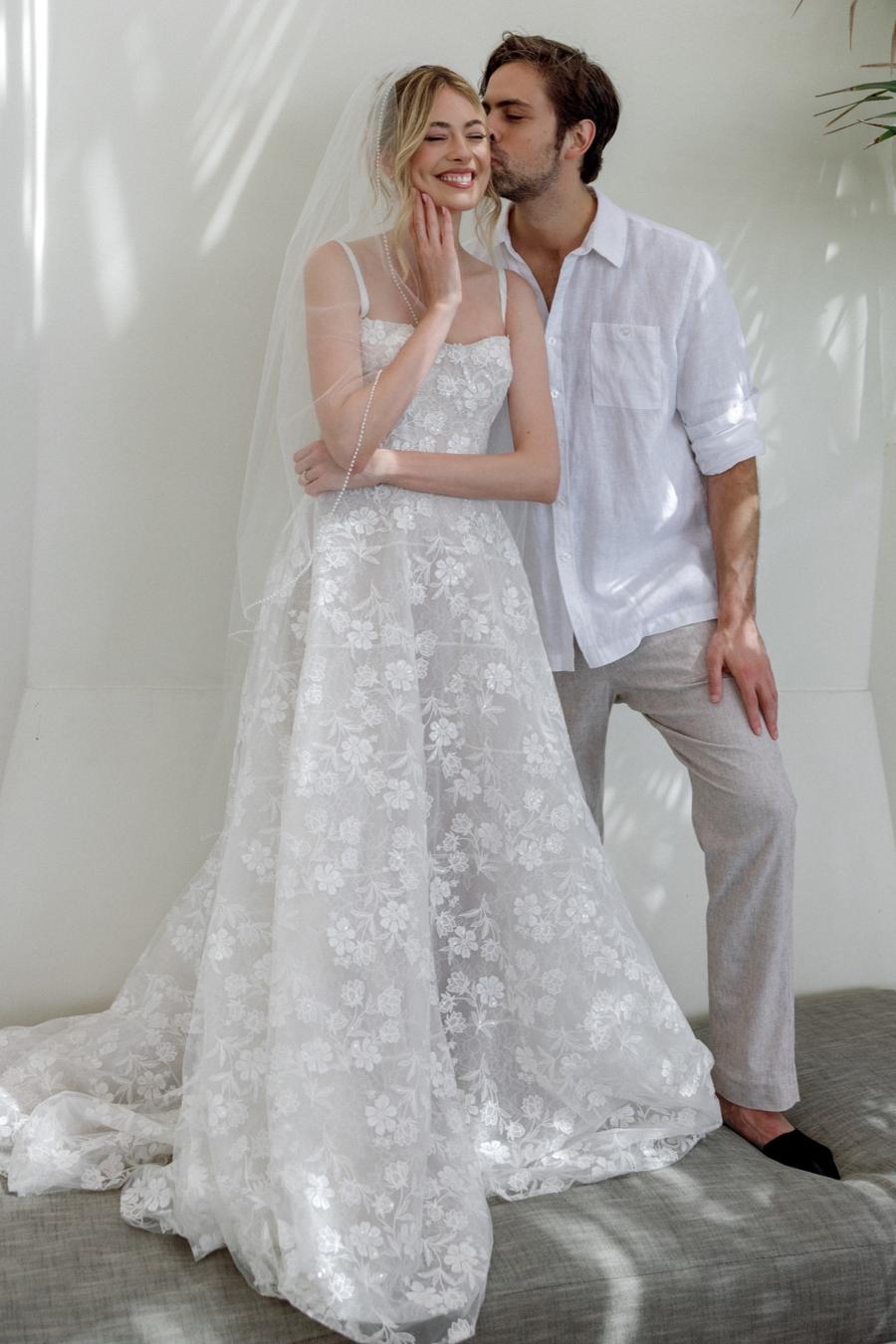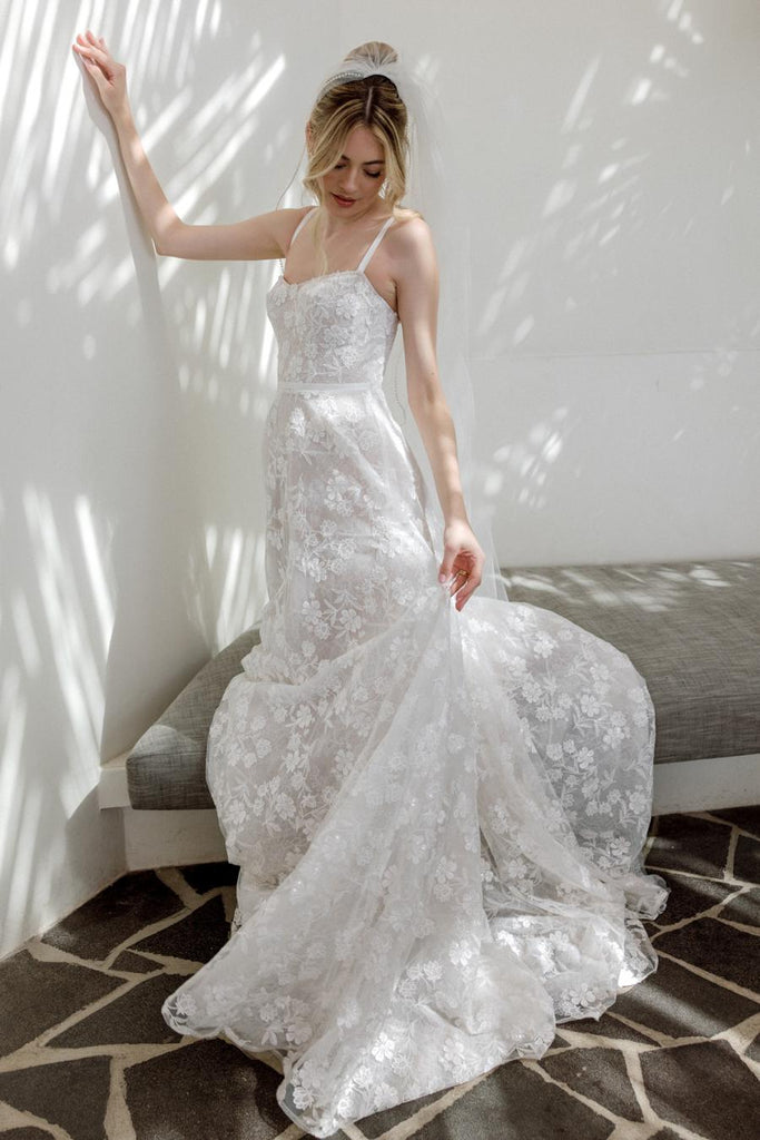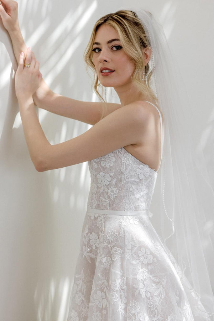 Consider this your floral fairytale moment. Quill features a sweetheart neckline, fully boned bodice, and custom tousled floral embroidery that floats over layers of airy tulle. The fit is soft and romantic, while a removable bow belt adds a playful touch to this blooming A-line beauty.