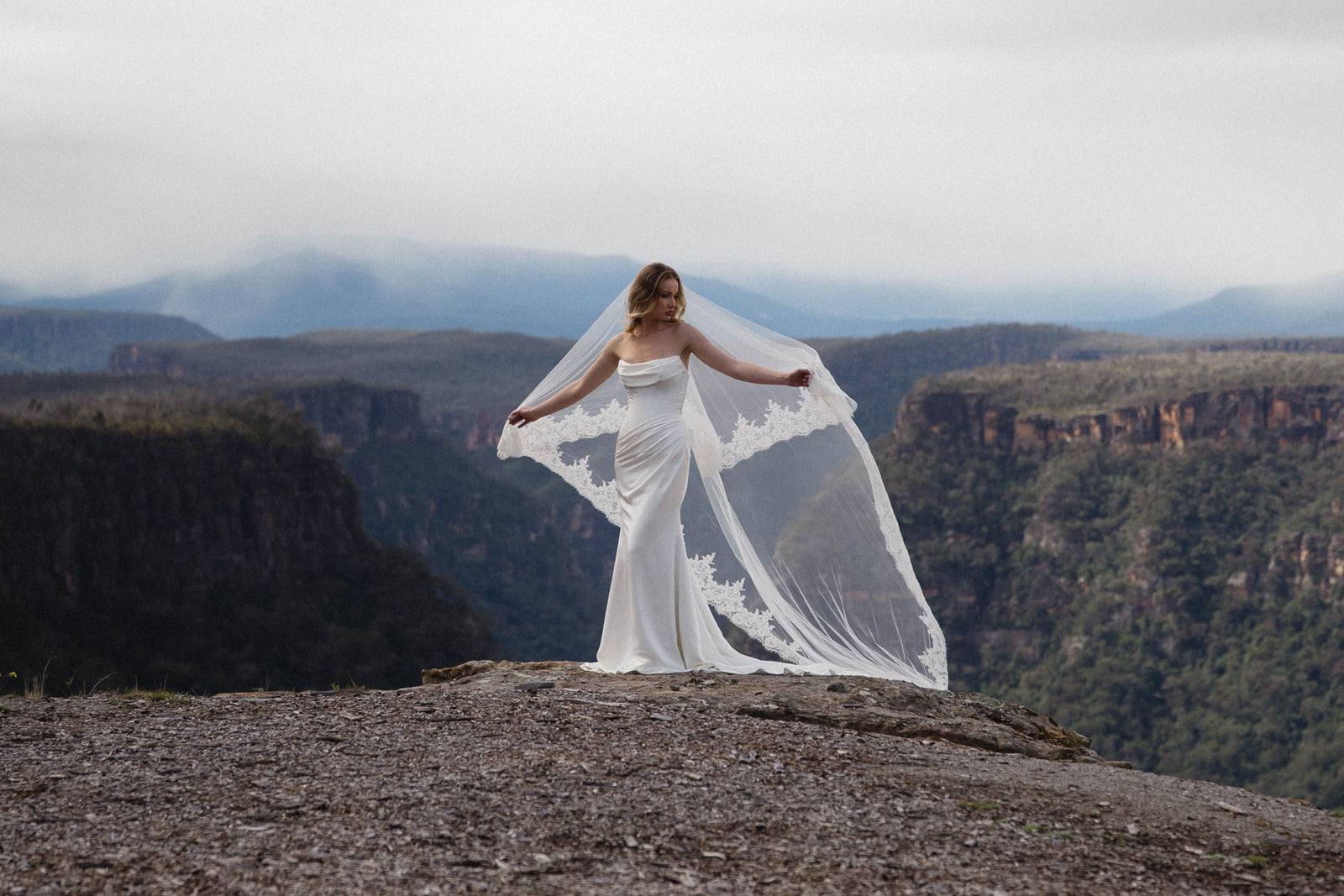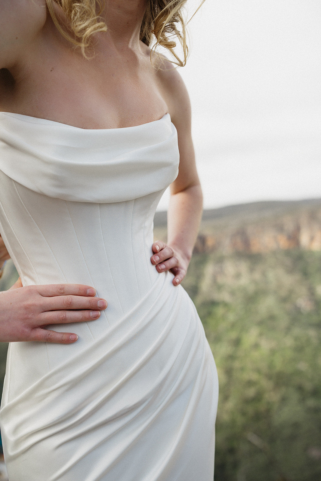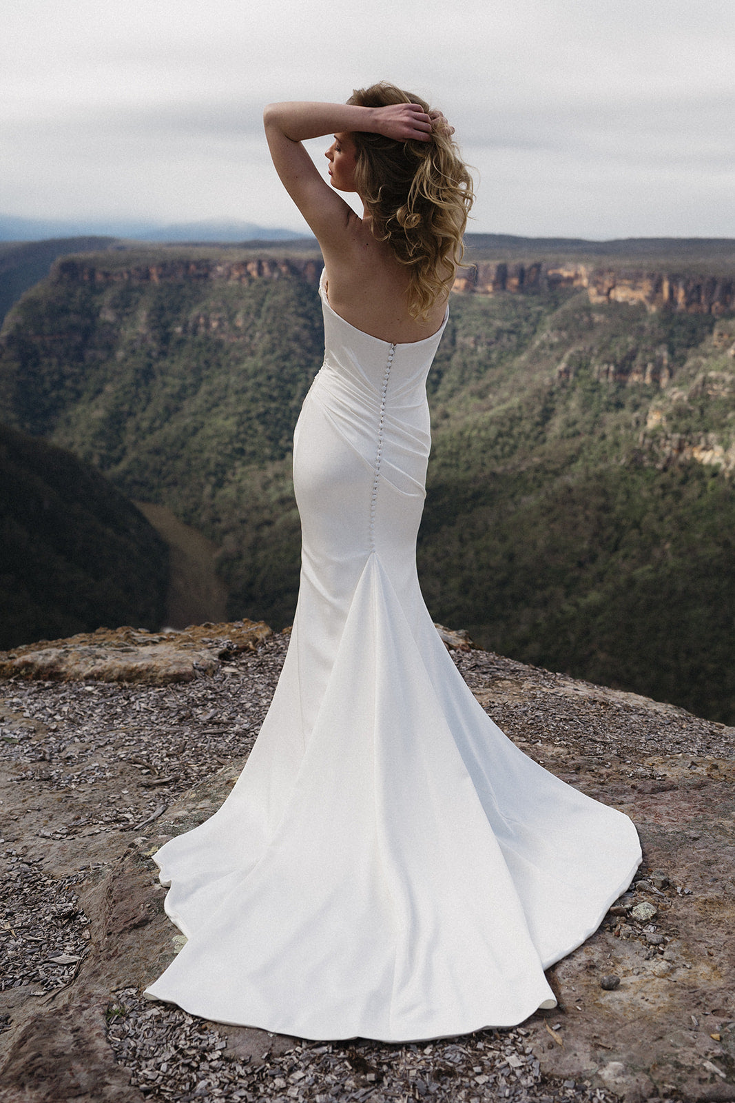 Bindi is bold and original, revealing new power from every angle. This sculptural gown combines an elongated, asymmetrical corset that carves the body with precision, paired with soft satin that drapes fluidly for effortless movement. Every fold is hand-placed to finish in perfect harmony with a delicate row of buttons. Empowered, feminine, and unforgettable, Bindi is a study in strength and beauty—a dress that celebrates your confidence and individuality on your most important day.