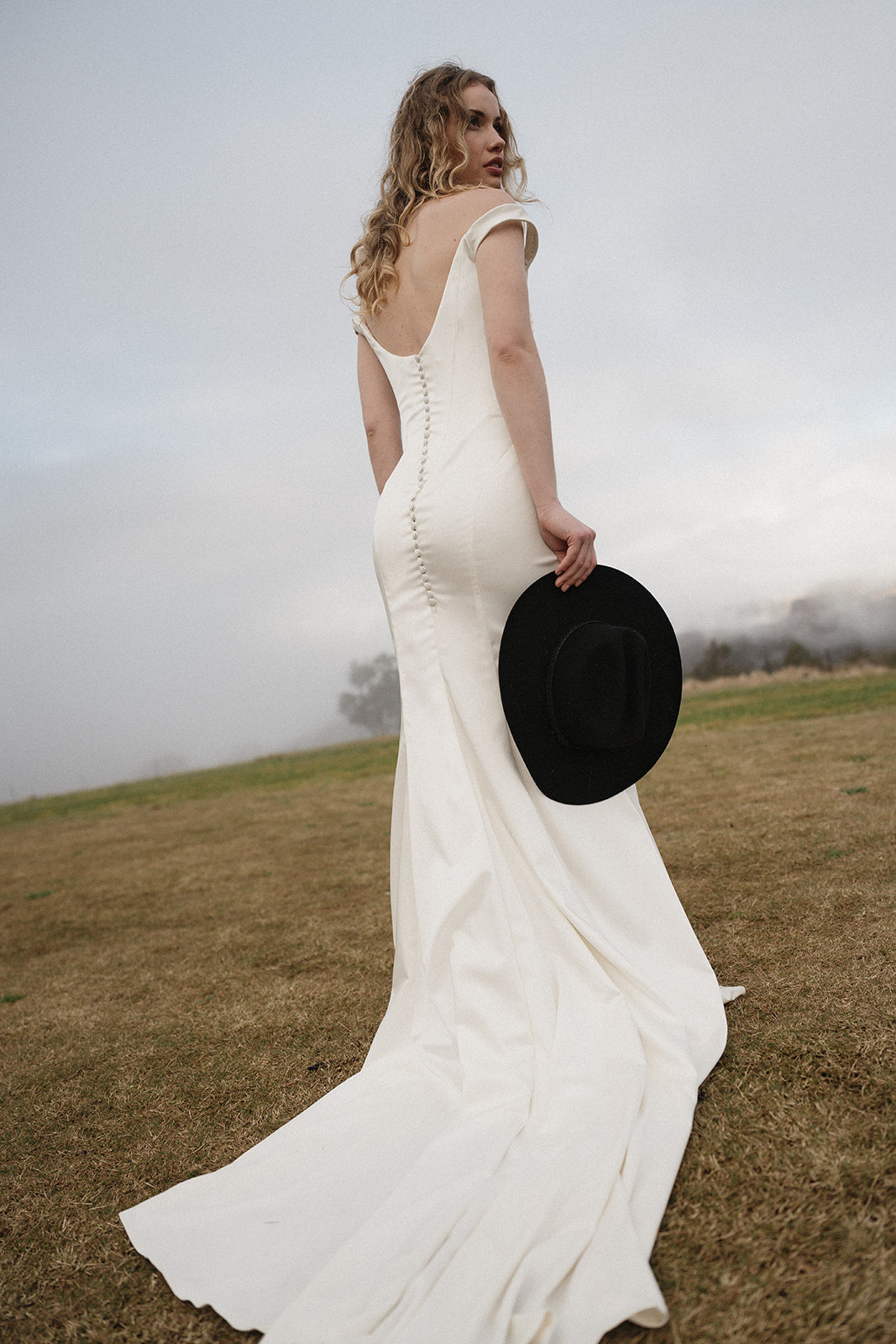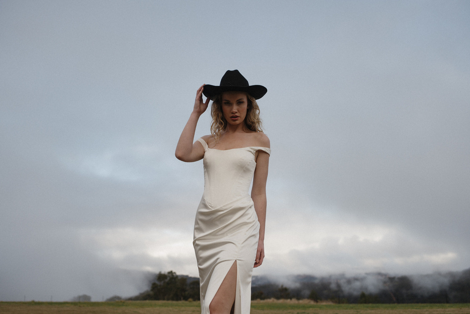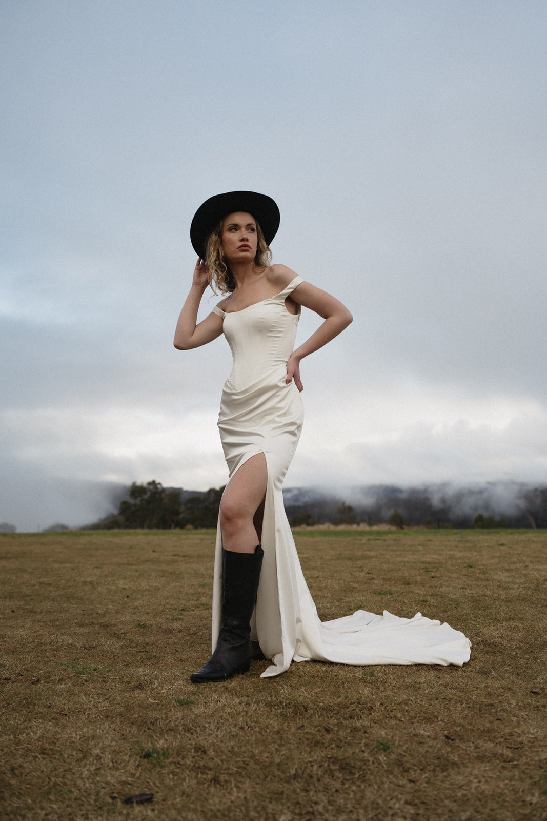 The Cleo embodies modern feminism with architectural sophistication. Its elongated bodice transitions into a graceful asymmetrical drape, while a bold skirt split adds contemporary edge. The off-shoulder neckline delicately frames your collarbone, creating a silhouette that feels both empowered and elegantly refined. This is a gown crafted for those unforgettable moments—designed to make an entrance that lingers in memory long after the celebration ends.