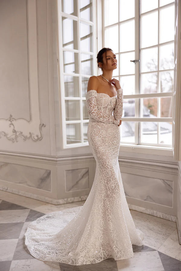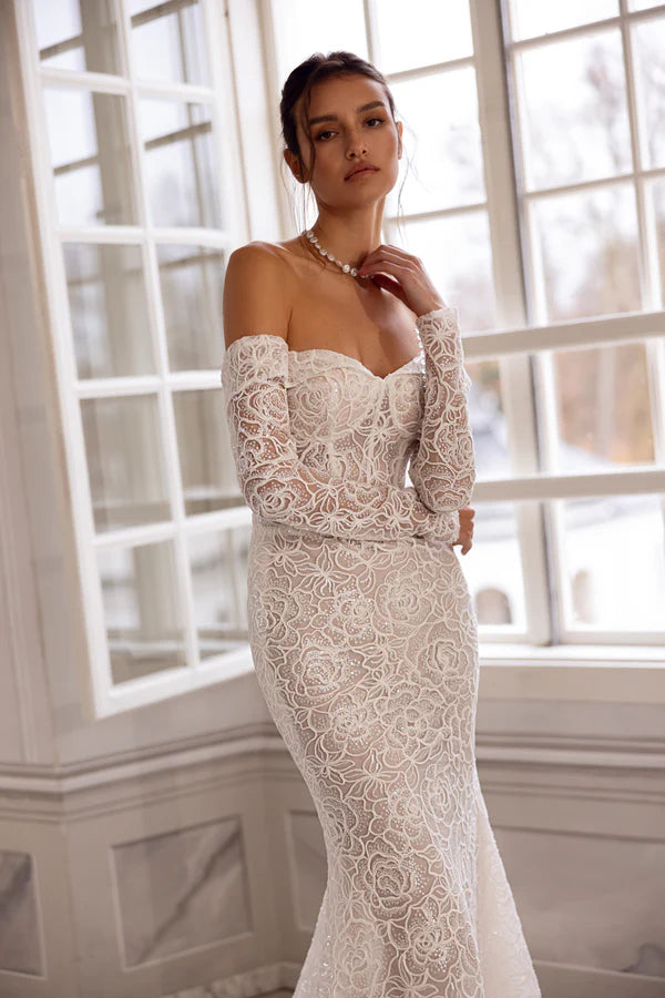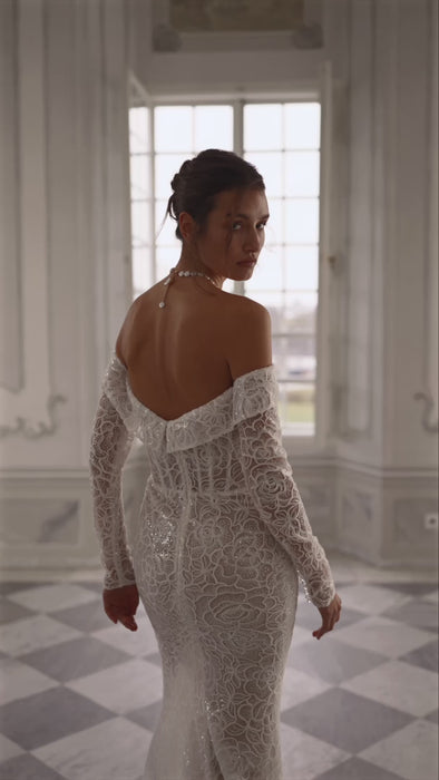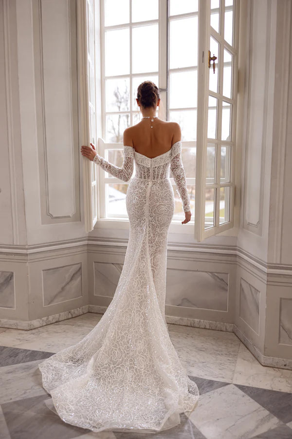 Gracefully sculpted, this mermaid gown captivates with a turned-up sweetheart neckline that enhances the décolletage. Lace and sequins catch the light with a soft shimmer, while a handcrafted beaded belt defines the waist. The sweeping train and striking back detail complete a look of effortless romance and confidence.