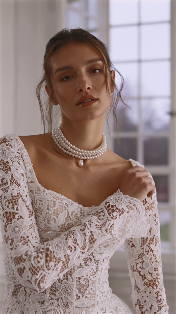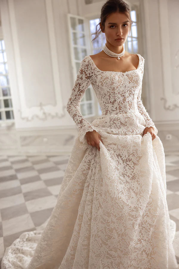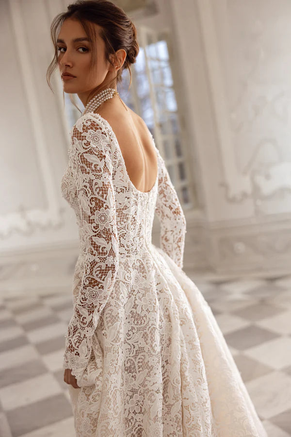 Refined and effortlessly romantic, this A-line gown in cappuccino or ivory is crafted from delicate French knitted lace. A handmade beaded belt cinches the waist, while hand-placed pearls adorn the corset. The open square neckline invites breath and movement, complemented by an oval back that adds a sensual yet poised allure.