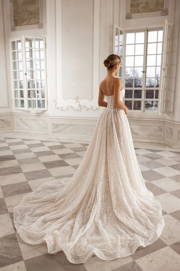 In cappuccino or ivory beaded Chantilly lace, this A-line gown is the definition of romance with an edge. The deep-slit bodice is hand-decorated with shimmering beadwork, while a detachable long-sleeve bolero with a turtleneck adds a regal touch. The flowing train feels light as air, embodying both delicacy and self-aware beauty.