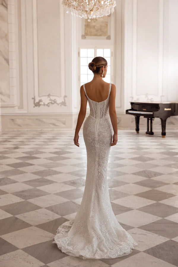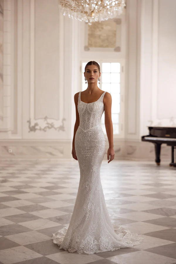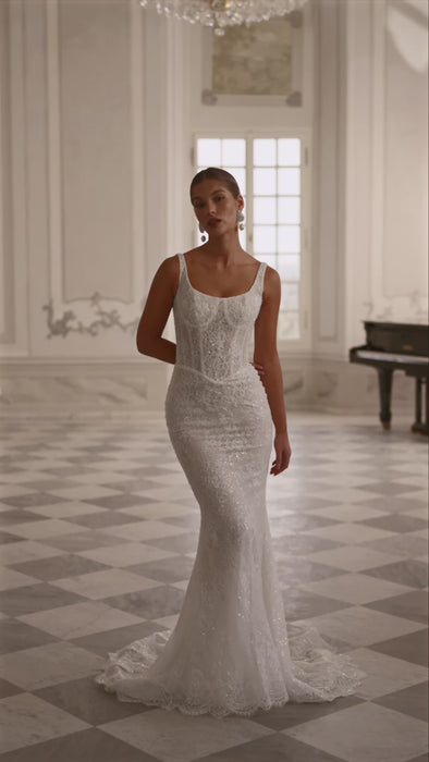 This stunning beaded chantilly lace gown with sleek body hugging silhouette features a modern basque waist and square neckline.