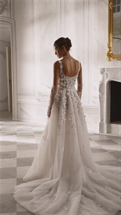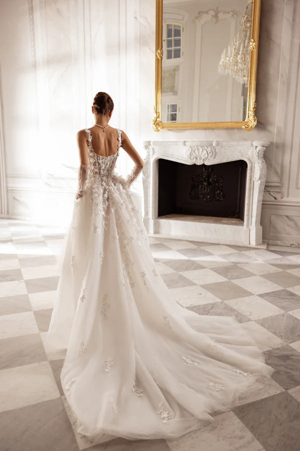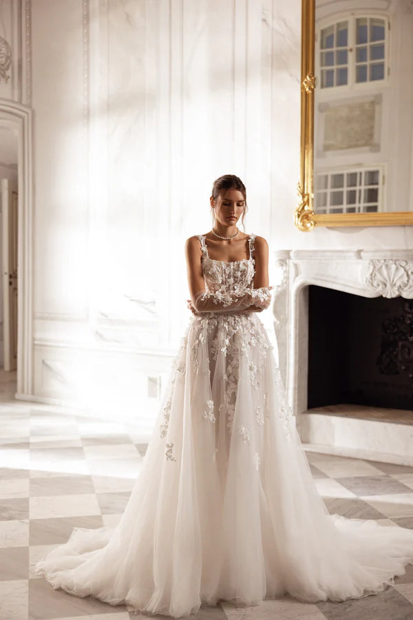 Made from ivory or cappuccino tulle with hand-decorated 3D lace flowers, this princess gown blooms with life. The square neckline and straps accentuate the shoulders and collarbones, while detachable gloves echo the floral motif. Airy and ethereal, this gown feels like a breath of fresh air, wrapped in the elegance of nature’s beauty.