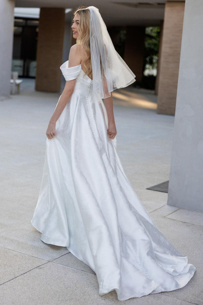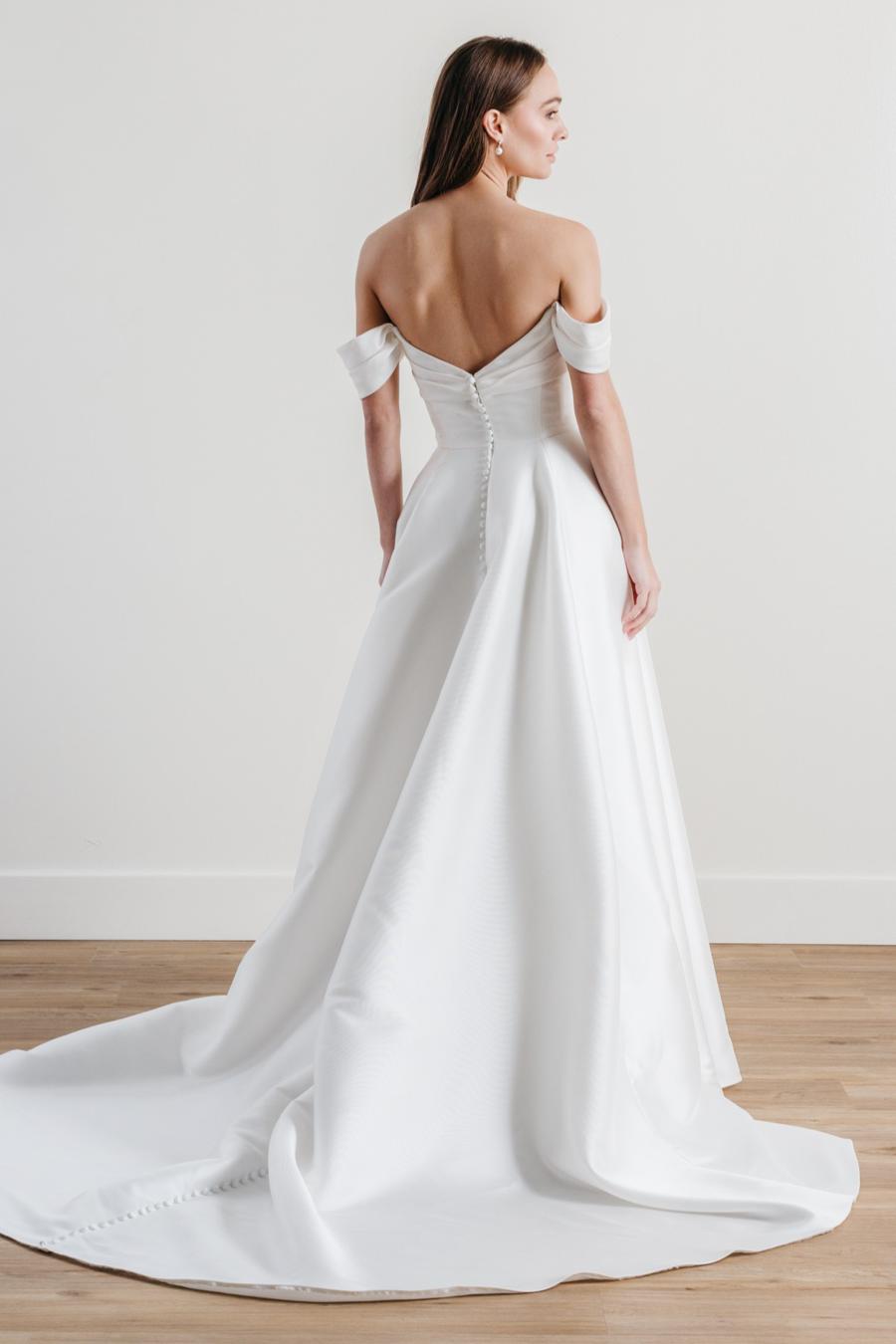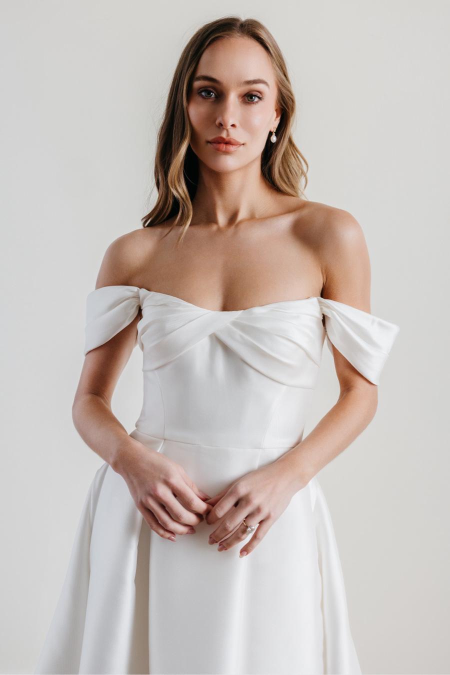 Off-the-shoulder and unforgettable, True brings the drama with its corset bodice and voluminous ball gown skirt. The slit adds a modern edge, while the Mikado and organza fabrics elevate this gown to a whole new level of opulence. For the bride who wants to make a statement, this is the dress that does just that.